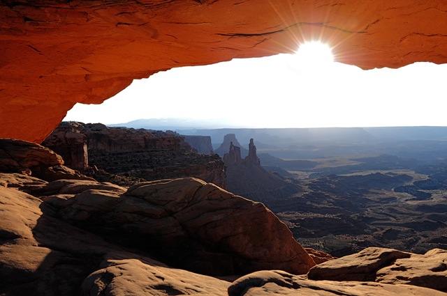 Jo, ich bin also rechtzeitig 10 Minuten vor Sonnenaufgang mit vollem Rucksack und großem Stativ am Mesa Arch. Wer ist vor mir da – eine ganze Horde fotosüchtiger Profis und Amateure – ich bin der letzte und werde ein wenig verspottet. Nix Early Bird und so – “You’re late!” grinsen sie mich an! Ich zeige stolz min GPS und präsentiere dessen Voraussage für den Sonnenaufgang an diesem Geopunkt zu diesem Tage – es kehrt andächtige Ruhe ein… Und, es stimmt perfekt! Auf die Minute genau erhebt sich die Sonne hinter den La Sal Mountains! Das Gerangel um die besten Plätze ist längst entschieden – ich habe verloren! Also versuche ich mir etwas längerer Brennweite zwischen den Rücken der Early Birds hindurch einen Blick auf den Mesa Arch zu erheischen. Rechts von mir steht ein bulliger Typ mit dicker Winterjacke, sein linker Ellenbogen ragt immer wieder ins Bild. Links ein etwas älteres sehr nettes Paar ganz aus der Nähe. Er links außen, sie direkt vor meinem linken Fuß. Beide haben eine Nikon D200 und ein original Nikon 12-24mm Weitwinkel. Die Stative sind die gleichen, die Kabelauslöser auch. Lustig ist. dass sie immer wieder überhaupt nicht klar kommt und ihr Mann total angenervt reagiert. Es klingt so als würde er denken “Warum hast Du das nicht daheim mal geübt und warum hinderst Du mich jetzt daran das Foto zu machen mit dem ich berühmt hätte werden können!” Die Situationen ähneln sich. Ich sitze oft daheim mit meinen Kameras auf dem Sofa und spiele solange damit herum, bis ich alles im Schlaf bedienen kann. Wenn es dann drauf ankommt muss schließlich jeder Handgriff sitzen.