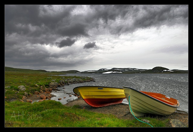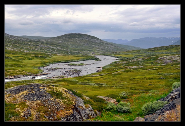 Durch abenteuerliche Tunnelsysteme schraubt sich später die Straße hoch auf 1300 Meter. Oben angekommen ist auch gleich einer der größten Wasserfälle Norwegens auf der links Seite. Aber der Parkplatz ist rappelvoll, es stürmt und regnet. Im Reiseführer steht, dass man ein paar Kilometer laufen oder eine Mautstraße nehmen soll. Dafür haben wir heute keine Zeit, schon gar nicht bei diesem Sauwetter. Es geht also weiter. Die Baumgrenze haben wir irgendwie in einem der verschlungenen Tunnel überwunden. Hier oben gibt es nur noch moosbewachsene Felsen. Die Landschaft ist einzigartig. Zwischen Felsen, langen Grasflächen ,wilden Bächen und großen Seen geht es quer durch Hardangervidda. Irgendwann kreuzen wir eine Bahnlinie – ich bin geplättet!! Im Reiseführer lese ich später, dass es sich um die vor gut 100 Jahren eröffnete berühmte Strecke zwischen Oslo und Bergen handelt – aha – man kann sich das ganze Gegurke mit dem Wohnmobil auch sparen und einfach entspannt mit dem Zug fahren 🙂