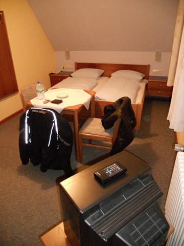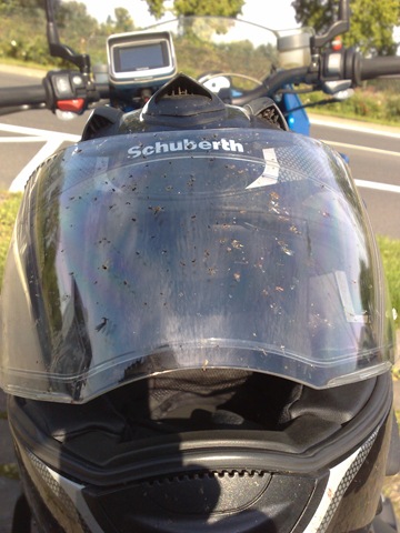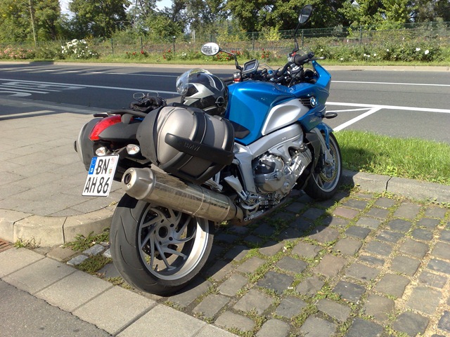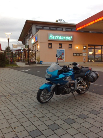 Auf der Autobahn zieht es sich wie Kaugummi, es ist wird dunkel und in der Nähe von Stromberg an der A61 fahren wir einen Rasthof an, der Sprit ist fast alle. Es gibt einen Snickers und dann geht es weiter. Unter unseren Helmen beißen wir die Zähne zusammen. Florian hat einen sauteuren original BMW Helm – Made by Schuberth. Das Visier hat eine Antibeschlagbeschichtung, nur heute wo er sie braucht blättert sie langsam aber sicher ab. Er fährt meist im Blindflug. Auf der Autobahn wechseln wir uns ab, mal fährt er vor, mal fahre ich vor. Eigentlich ist es mir lieber wenn er vor mit ist, dann muss ich nicht ständig schauen ob er noch dran bleibt. Meine K1200 hat fast die doppelte Motorleistung, da ist es einfach ihn nicht zu verlieren. Als wir kurz vor 21h in Bonn ankommen sind wir ziemlich erledigt. Ich liefere den großen Bruder im Hotel ab und bin froh als ich heil daheim angekommen bin. Die Treppen von der Tiefgarage nach oben fallen mir schwer. Um so schöner ist es, dass Sandra mir die Türe öffnet als ich noch schnaufend auf der Treppe stehe. Welch ein Service! Es gibt Spaghetti Bolognese – der Tag ist gerettet!
