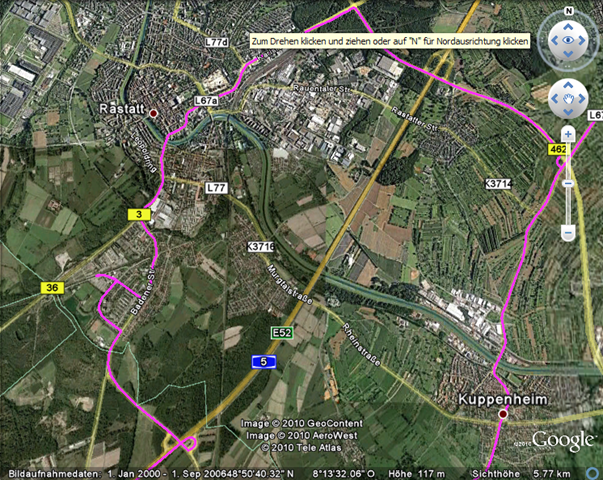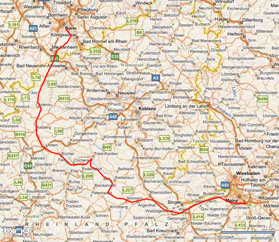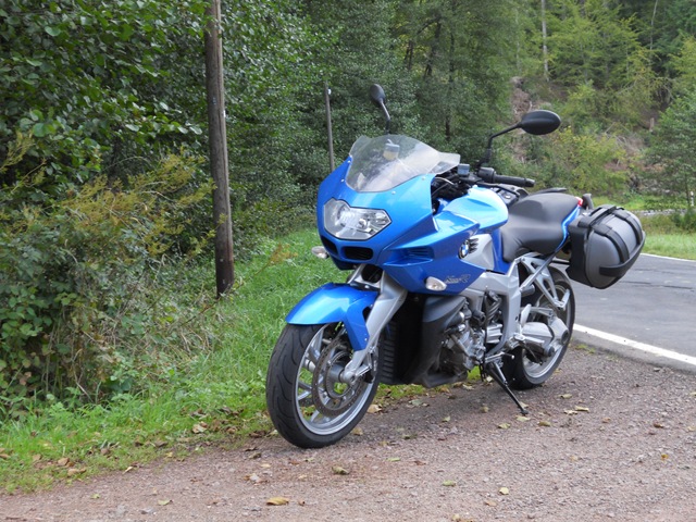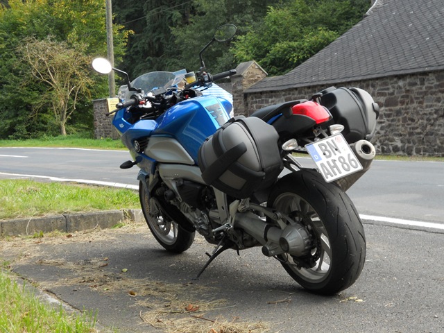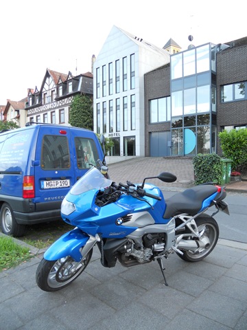 Auf der Autobahn geht es gut voran, aber es ist viel los – Freitagnachmittag! Bei Rastatt ist dann alles vorbei. Autos stauen sich auf vier Fahrspuren! Wir fahren ein langes Stück über den Standstreifen. Ich haben Angst, dass meine K1200 wieder heiß laufen könnte. Jenseits der Autobahn lotsen uns die Navis auf ganz seltsame Wege, das kann alles nicht wahr sein. Wir halten Kriegsrat, dann sage ich meinem TomTom, dass es uns nach Bonn bringen soll und dass wir NICHT auf die Autobahn wollen. Das klappt recht gut auch wenn wir lange im Regen an echt roten Ampeln herumstehen.
