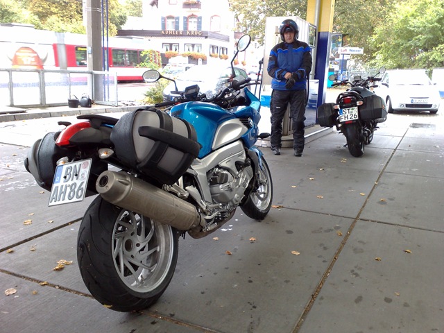 Volltanken und los! Ein paar hundert Meter weiter ist dann die Hölle los, nichts geht, es ist Freitag und wir haben etwa 15h. Wir stehen im strömenden Regen mitten im Stau. Irgendwann meldet der Bordcomputer meiner K1200 ein Problem. Ein rotes Warndreieck blinkt und es werden ein Motorsymbol mit einem Ausrufezeichen und eine kleine Ölkanne angezeigt. Nein bloß das jetzt nicht!! Anhalten geht nicht, absteigen auch nicht, wir stecken mitten drin. Ich bange um den Motor, aber er läuft ganz normal. Als wir etwa 15 Minuten später endlich raus aus dem Schlamassel sind halten wir unter einer Brücke. Motor aus und das Handy raus kramen, ich will beim Motorradhaus Senger anrufen um zu fragen was ich tun soll. Florian meint wir sollten bis zur nächsten Tankstelle fahren, vielleicht ist nur zu wenig Öl drauf. Mein TomTom sagt, dass es nur ein paare hundert Meter sind. Warum nicht, hier können wir eh nicht bleiben. Als ich das Handy wieder eingepackt habe starte ich den Motor und alles scheint wieder ganz normal, nichts blinkt, nichts leuchtet. Hm, ob sie vielleicht einfach nur zu heiß war? Ich denke positiv und wir fahren weiter.