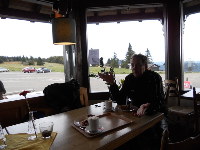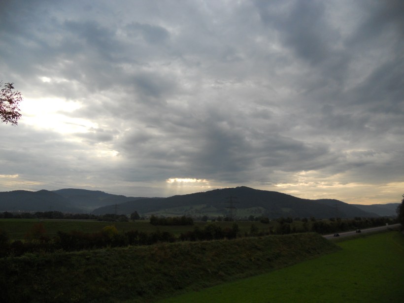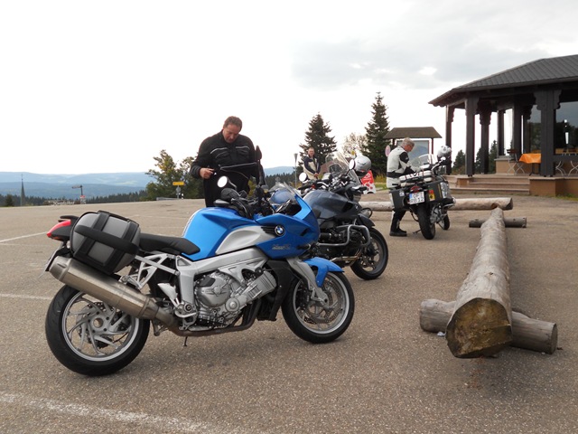 Als wir losfahren ist der Himmel dramatisch bedeckt, aber es ist trocken. Der große Bruder hat ne tolle Route geplant, ich bin verzückt. Wir machen einen kleinen Abstecher hoch zum Kandel, dort gibt es heißen Kaffee. Kalt ist es, aber wir sind gut angezogen. Wir treffen zwei Biker die eine Tour in den Pyrenäen geplant hatten. Die Tour sollte via Autoreisezug starten. Leider haben sie erst am Bahnhof erfahren, dass in Frankreich mal wieder gestreikt wird! Also ab in den Schwarzwald, eine geniale Alternative!