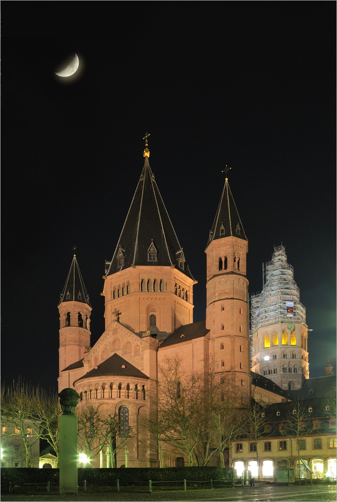 Hier in perspektivisch entzerrtes HDR des Mainzer Doms. Den Mond habe ich separat mit 135mm Brennweite fotografiert, der Dom ist mit 28mm Brennweite aufgenommen. Den Mond habe ich dann dort eingesetzt wo im HDR nur ein weißer Fleck war.