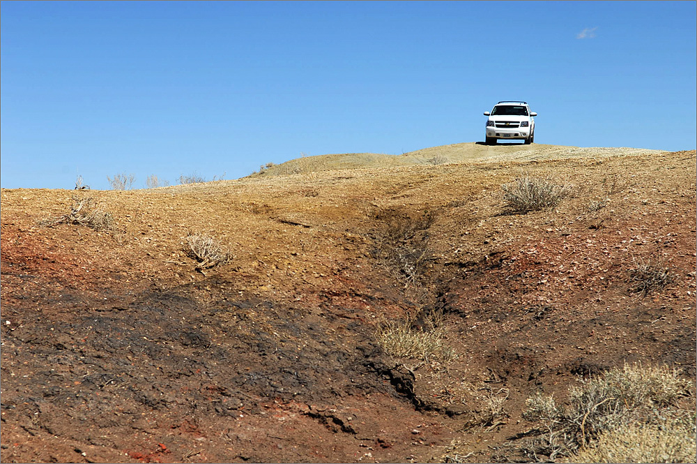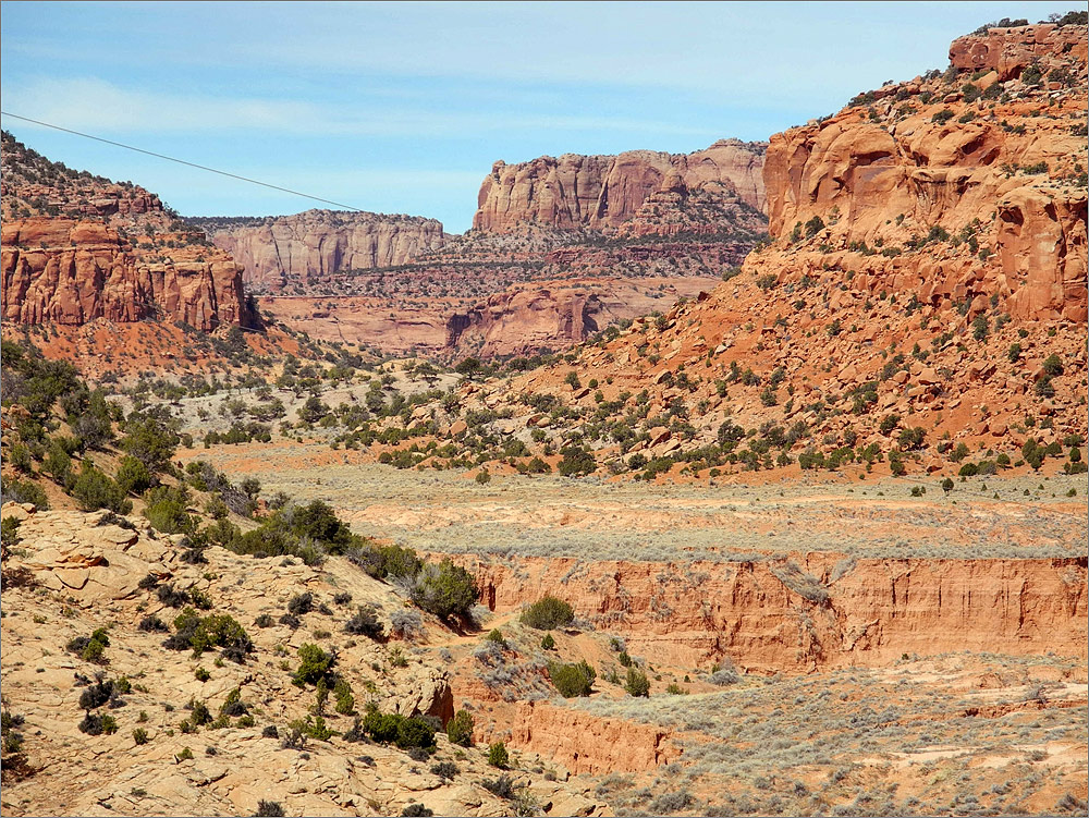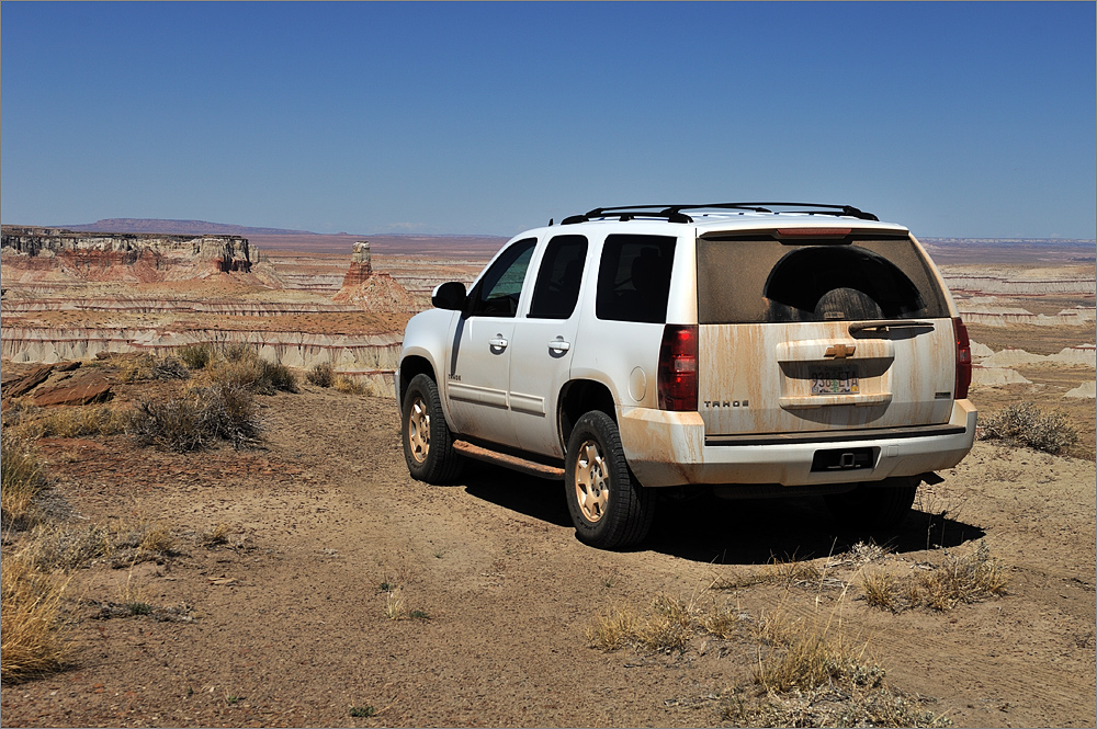 Auf der ersten Anhöhe bleibe ich mal stehen, das Panorama ist famos. Aber gleich neben mir ist auch wieder eine wilde Müllkippe. Was hier einfach alles abgekippt wird ist schon erstaunlich! Während ich meine erste Fotos mache kommt ein weißer Chevrolet Suburban auf mich zugefahren. Ich bekomme einen Schreck, bin ich auf einem Privatgrundstück? Da stand aber nichts von wegen „Private Property – Keep out“ oder ähnlich. Als das Auto dann fast bei mir ist kann ich eine nette Indianerlady erkennen. Sie winkt freundlich und fährt einfach weiter. Super, alles ist gut. Während ich noch ein Foto machen will ist sie plötzlich auf dem Foto, aber so von weit weg – wie hat sie das nur gemacht? Ich steige ein, es geht weiter. Kurz drauf weiß ich wie sie es gemacht hat, es geht krass den Berg hinab! Links kann ich den Rand des Canyons sehen. Ich biege ab und kann fast bist an den Rand heranfahren. Das Panorama ist grandios, aber ich bin mir unsicher ob das auch erlaubt ist. Einige prüfende Blicke nach links und rechts, ich bin ganz allein.