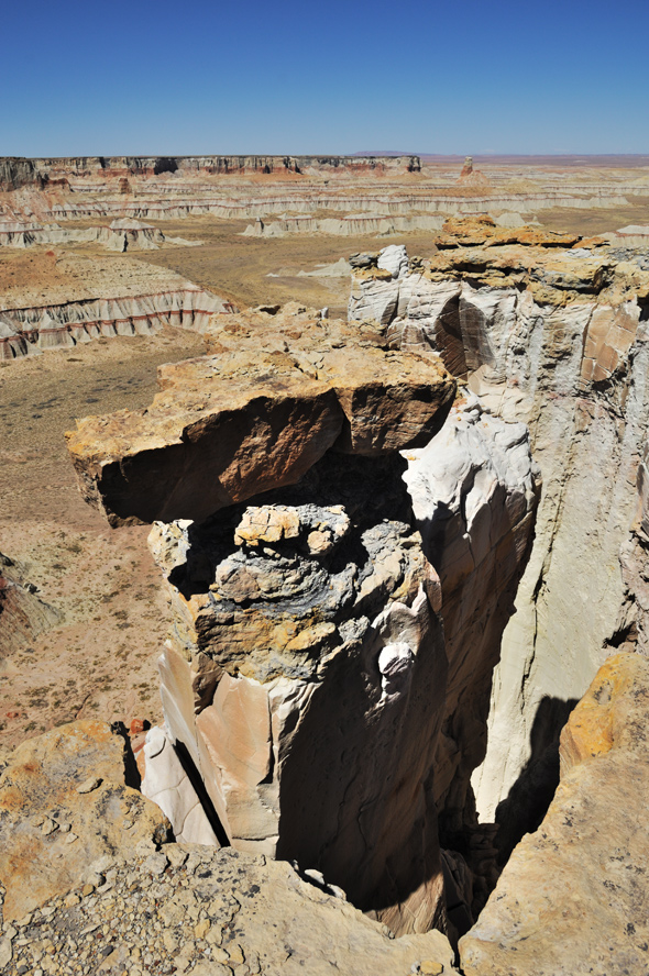 Dann geht es weiter, ich möchte noch einmal in aller Ruhe und ganz ohne Sturm zum Coalmine-Canyon. Im vorletzten Jahr hat es uns ja fast in den Canyon geweht und Wolfgang hat dort sein GPS verloren. Ich habe in meinem Garmin einen Wegpunkt gespeichert, den habe ich noch auf der Festplatte gefunden. Aber ich suche trotzdem mal auf dem Handy-Navi ob es des Coalmine-Canyon dort nicht gibt. Super, da steht Coalmine Mesa, das klingt gut! Als ich eine halbe Stunde später dort ankomme muss ich feststellen, dass Coalmine Mesa eine kleine Geisterstadt ist. Mit dem Canyon hat das nicht viel zu tun, ich bin schon wieder 10 Kilometer zu weite gefahren. Also wenden! Kurze Zeit später bin ich noch längst nicht an meinem Wegpunkt als ich einen Abzweig sehe. Es geht auf die Bremse und ich biege rechts ab. Den Canyon kann ich schon sehen, es scheint eine andere „Zufahrt“ zu sein als die die ich schon kenne.