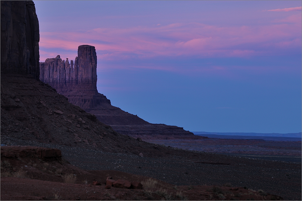 Bei den Five-Padres angekommen ist die Sonne dann auch weg. Ich stelle den Tahoe so, dass ich die Location mit dem Fernlicht ausleuchten kann. Mein Plan ist, noch eine Stunde zuwarten bis es völlig dunkel ist und dann ein paar Fotos mit der Nikon F80 auf Velvia 50 zu versuchen. Irgendwas mit ganz ganz langen Belichtungszeiten. Der Himmel ist wolkenlos, man sollte neben dem Mond alle Sterne sehen können. Das kommt vielleicht ganz gut. Eine andere Alternative wären ein paar HDRs dieser coolen Location im Fernlicht des Tahoe.