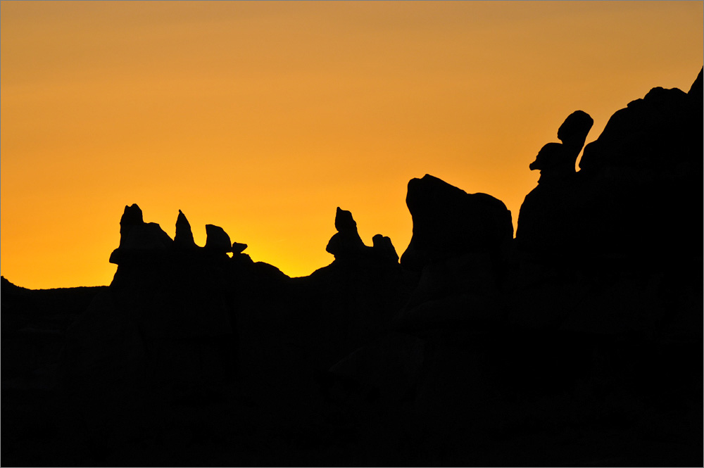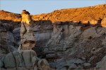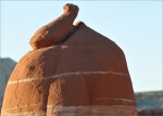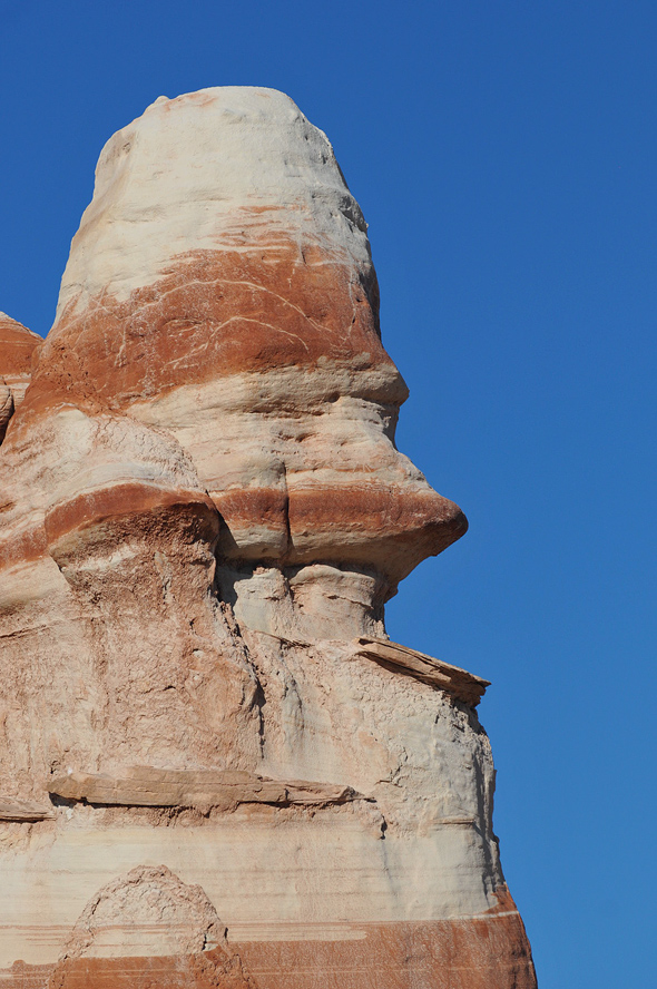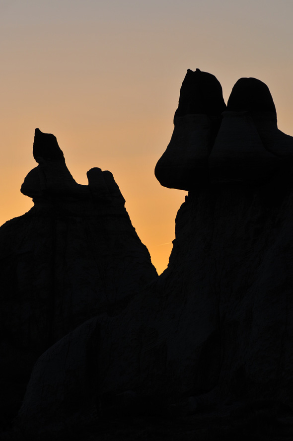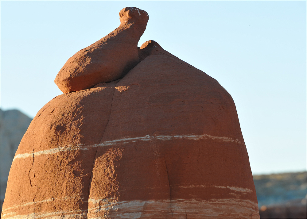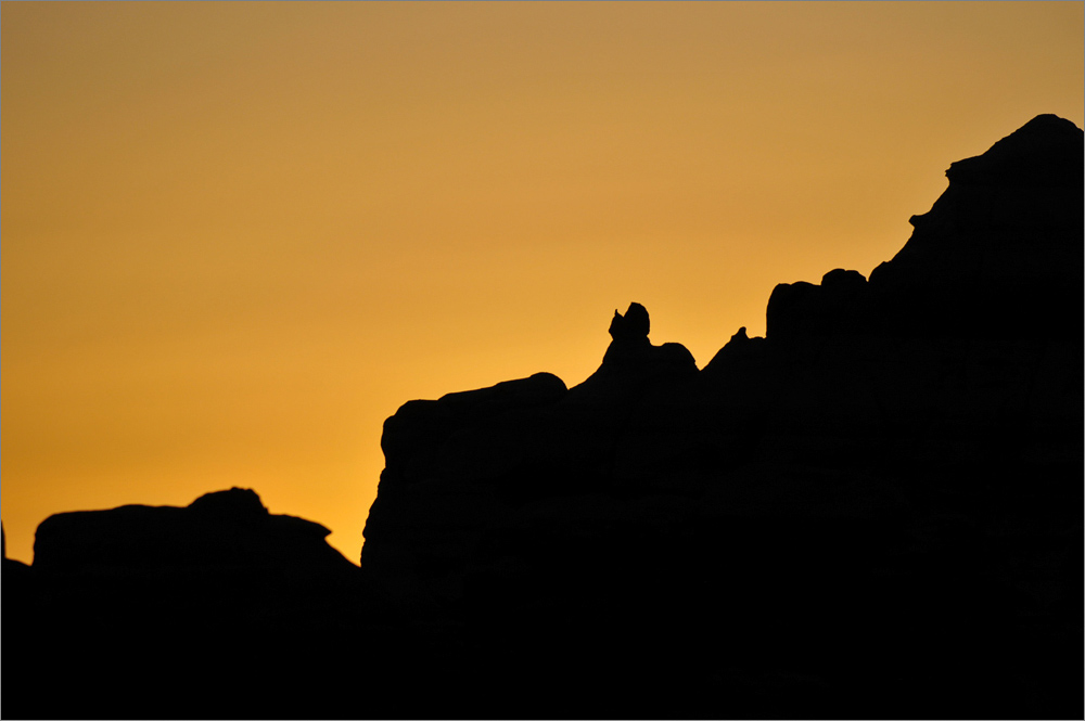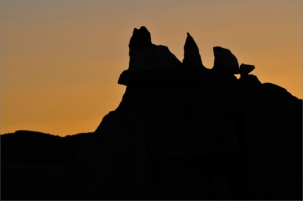Als ich die „Five Padres“ passiere sind es noch etwa 30 Minuten bis Sonnenuntergang. Ich fahre einfach mal weiter, mal schauen was es noch so gibt. Ich finde etwas später eine Säule die mich sehr an den Hund aus der Fernsehserie „Peanuts“ erinnert. Es ist Snoopy und er steht auf seinen Hinterbeinen. Die Sonne steht tief, nur sein Kopf ist noch im Licht, der Rest ist schon im Schatten. Allein dieses „Ding“ würde es lohnen noch einmal zurück zu kommen!