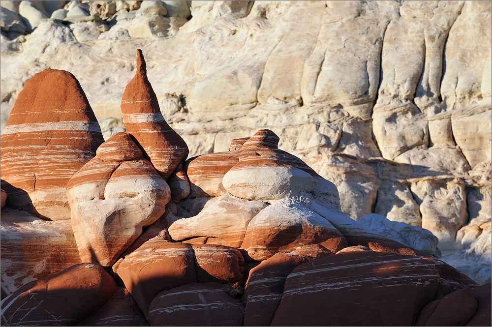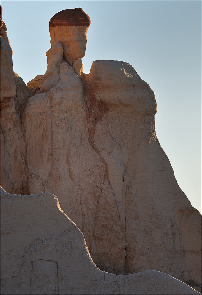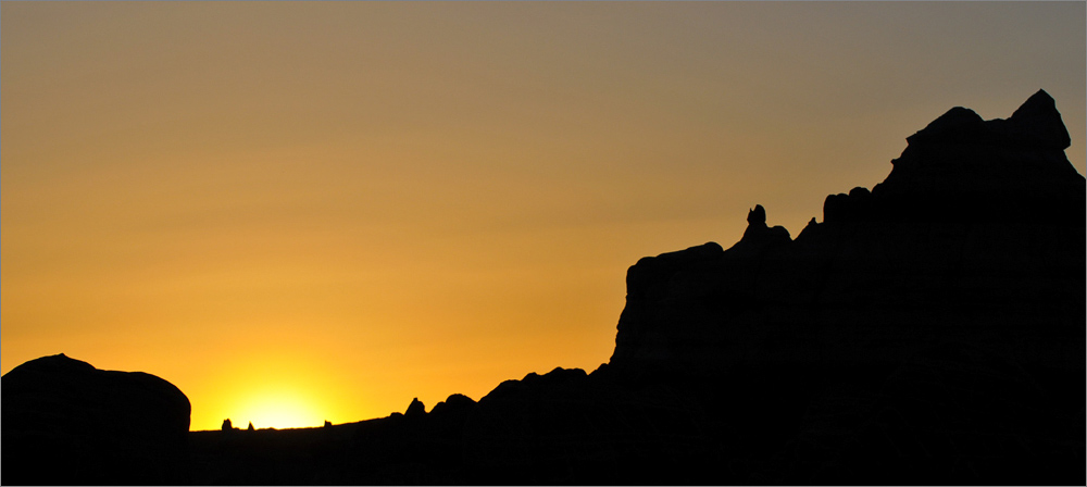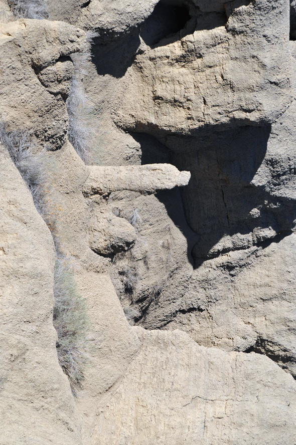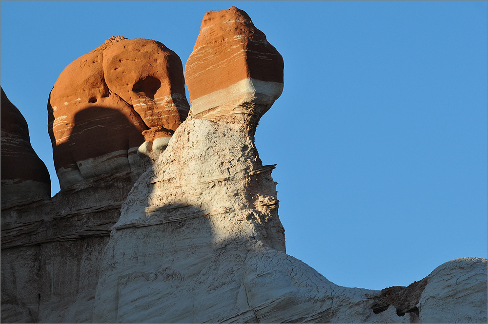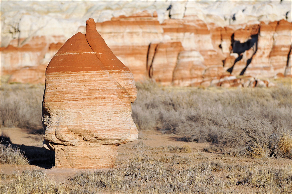 Als ich die „Five Padres“ passiere sind es noch etwa 30 Minuten bis Sonnenuntergang. Ich fahre einfach mal weiter, mal schauen was es noch so gibt. Ich finde etwas später eine Säule die mich sehr an den Hund aus der Fernsehserie „Peanuts“ erinnert. Es ist Snoopy und er steht auf seinen Hinterbeinen. Die Sonne steht tief, nur sein Kopf ist noch im Licht, der Rest ist schon im Schatten. Allein dieses „Ding“ würde es lohnen noch einmal zurück zu kommen!