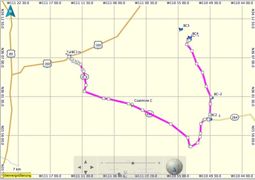 Hier ist das Bild dazu, es kann via „Klick“ vergrößert werden. Der Blue Canyon ist oben rechts in der Ecke, die Straße verläuft an der unteren rechten Ecke.