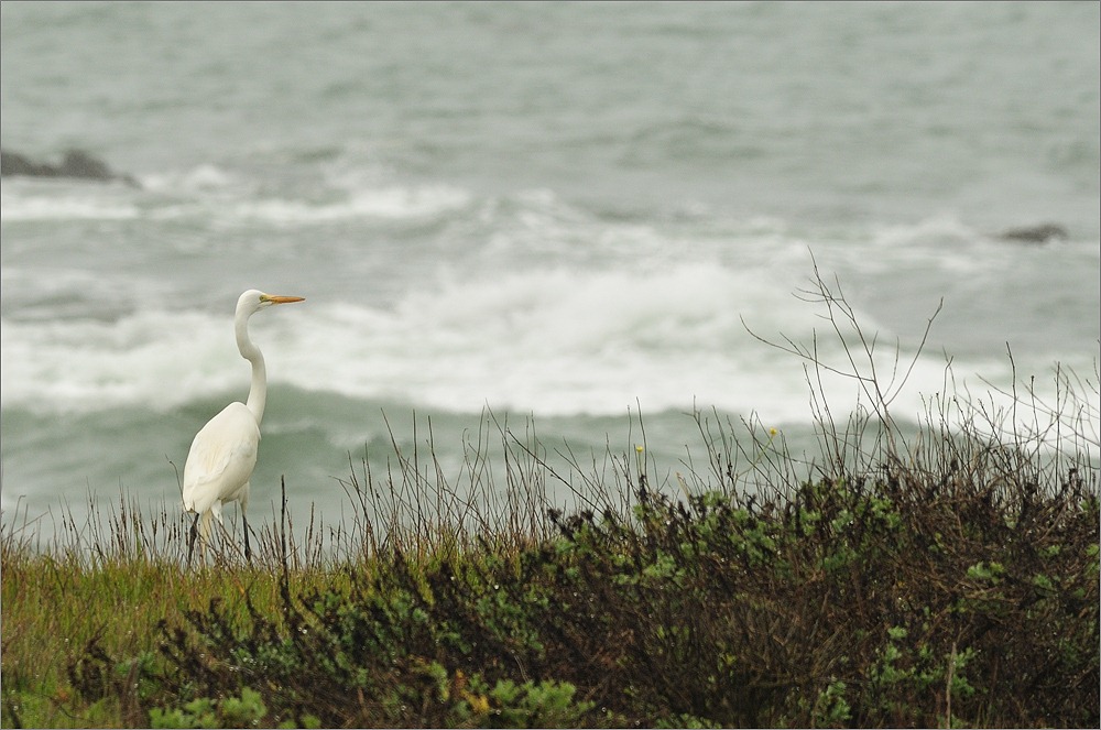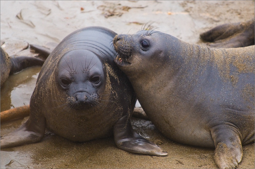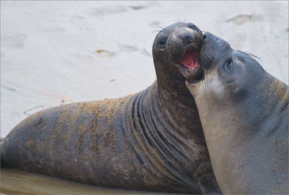 Ok, noch mal gut gegangen! Wir sind wieder unterwegs. Ein paar Minuten später sind dann wieder ein paar Reiher rechts im Feld, ich fahre kurz an den Seitenstreifen und Sandra hat Gelegenheit für ein paar Fotos, dann sind die scheuen Tiere auch schon wieder fort. Mir fällt dann auf der anderen Seite ein kleiner Seelöwe auf, er kriecht durch die Sanddünen und ruft ganz verzweifelt. Ob er sich wohl verirrt hat? Kurz danach ist dann ein Parkplatz vor dem man gleich eine ganze Seelöwen-Kolonie sehen kann. Es ist Paarungszeit und die Tiere sind miteinander sehr beschäftigt 🙂