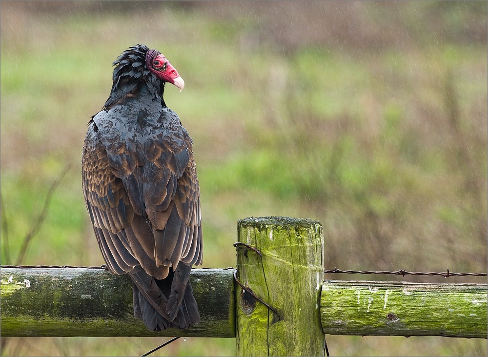 Etwas frustriert fahren wir weiter, die Kamera habe ich jetzt schussbereit auf den Beinen liegen. Dann sehen etwa sechs Reiher wie die Perlen auf der Schnur auf einem Zaun neben der Straße sitzen. Wir wenden und fahren langsam zurück. Die Tiere sind sehr scheu und fliegen schnell weg, aber ein paar Fotos können wir noch durch das geöffnete Seitenfenster machen. Leider regnet es so stark, dass im Auto gleich alles nass wird, was für ein Wetter.