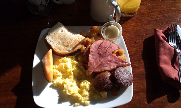 Um kurz nach 8h hält Sandra nichts mehr im Bett, wir ziehen uns schnell an und wandern hinüber zum Restaurant auf der anderen Straßenseite. Dort gibt es ein nicht wirklich cholesterinarmes Frühstück. Sandra fühlt sich, als wäre sie mit einem Baseballschläger getroffen worden. Dementsprechend ist ihre Laune. Wir bekommen einen schönen Tisch am Fenster zugewiesen. Und es gibt ein WLAN! Während ich in den letzten Neuigkeiten bei facebook stöbere scheint mir plötzlich die Sonne volle Kanone ins Gesicht. Und kurz zuvor habe ich meinem Freund Fabian noch geschrieben, dass er den Mut nicht verlieren soll und dass es selbst im sonnigen Kalifornien mal vorkommt, dass es regnet. Kaum ist der Kommentar bei Facebook gelandet, scheint mir so brutal die Sonne ins Gesicht, dass ich mir vorkomme wie im Sommerurlaub. Vielleicht ist das ja ein Zeichen! Vielleicht wird heute für alle unglücklich verliebten Menschen auf der Erde alles gut?