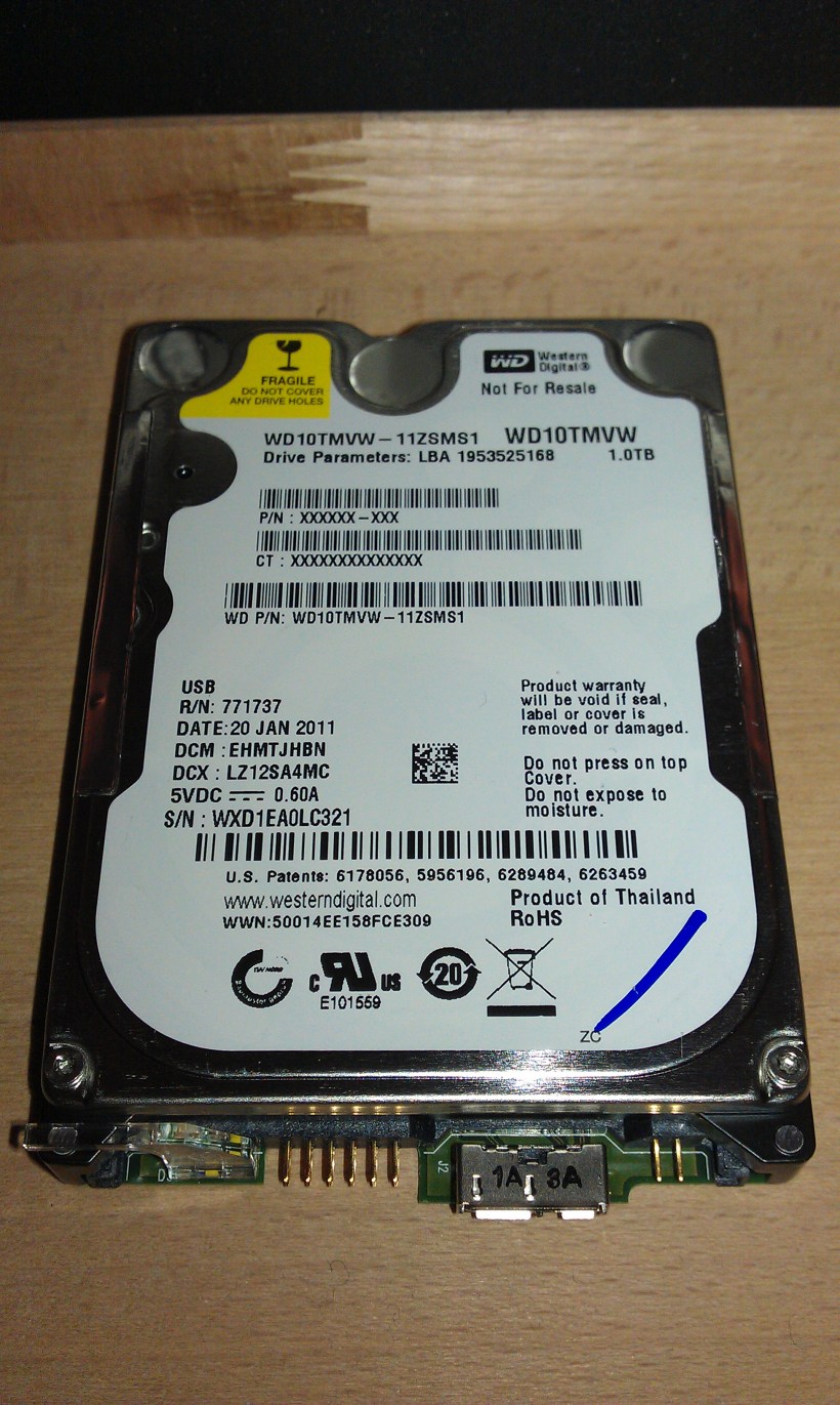 Dann kommt mein Nachbar Tobias. Während wir quatschen versuche ich mit einem Messer die kleine 2,5″ 1TB Festplatte aus ihrem Gehäuse zu fummeln damit sie später in den Mac eingebaut werden kann. Zwischen Quatschen, Bier und M&Ms rutscht sie mir dann aus der Hand und knallt auf den Boden. Super, so kann man sie auch zerstören… Irgendwann ist das Plastik-Gehäuse dann mit dem Messer aufgehebelt und wir beide staunen nicht schlecht als wir sehen, dass die USB-3.0 Schnittstelle hier direkt an die Festplatte angelötet ist. Eigentlich hätten wir eine SATA Festplatte erwartet die in einer kleinen Platine steckt die dann den USB 3.0 Anschluss hat. Aber so wird das inzwischen nicht mehr gespielt. Diese Festplatte ist auf das absolute Minimum reduziert. Und damit ist sie für den Einbau in den MacMini leider nicht zu gebrauchen. Na, falls sie den Sturz überlebt hat kann ich sie ja künftig benutzen um die vielen GoPro Videos darauf zu „lagern“.