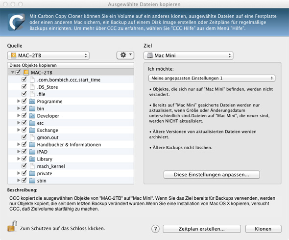 Dann werden die billige Lasermaus und die neue 2 TB große 3,5″ USB 2.0 Festplatte angeschlossen. Mit einem kleinen Kloß im Hals schalte ich den Mac ein. Das Gehäuse ist noch offen, wer weiß wofür das gut ist. Nach einer Weile findet er das Backup welches ich am Montag auf die externe Festplatte gemacht habe und startet tatsächlich von der externen Platte, das ist cool! Mit einem Windows-PC hätte das nicht funktioniert! Der Startvorgang dauert ziemlich lange, USB-2.0 ist eben doch ein Flaschenhals. Aber dann ist der Mac da. Nummer 5 lebt – großartig!