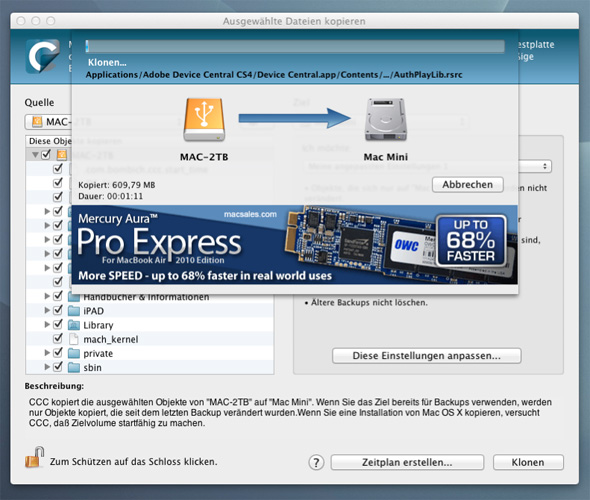 Nach ein bis zwei Minuten meldet der Mac, dass er eine nicht initialisierte Festplatte gefunden hat, super! Mit dem Festplatten Dienstprogramm wird die neue Momentus XT partioniert und formatiert. Beim Mac heißt das schlicht und ergreifend „Festplatte löschen“ – ok… Als sie „gelöscht“ ist, kann der Restore-Vorgang beginnen. Ich schaue es mir eine Weile an, der Mac schaufelt via USB 2.0 etwa 1,5GB pro Minute auf die neue interne Festplatte. Der gesamte Restore wird also etwa drei Stunden dauern. Prima, da kann ich am Mac Book den Film schneiden den ich gestern auf der Tour mit Hermann gemacht habe.