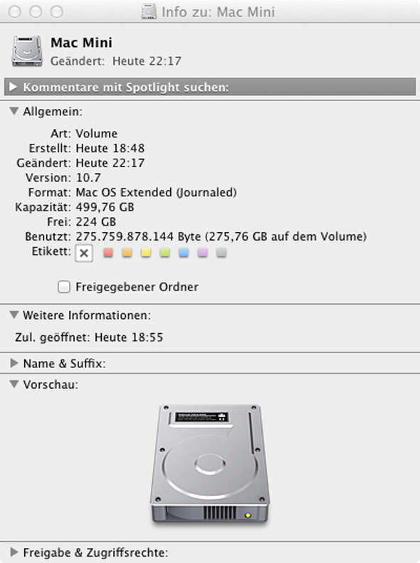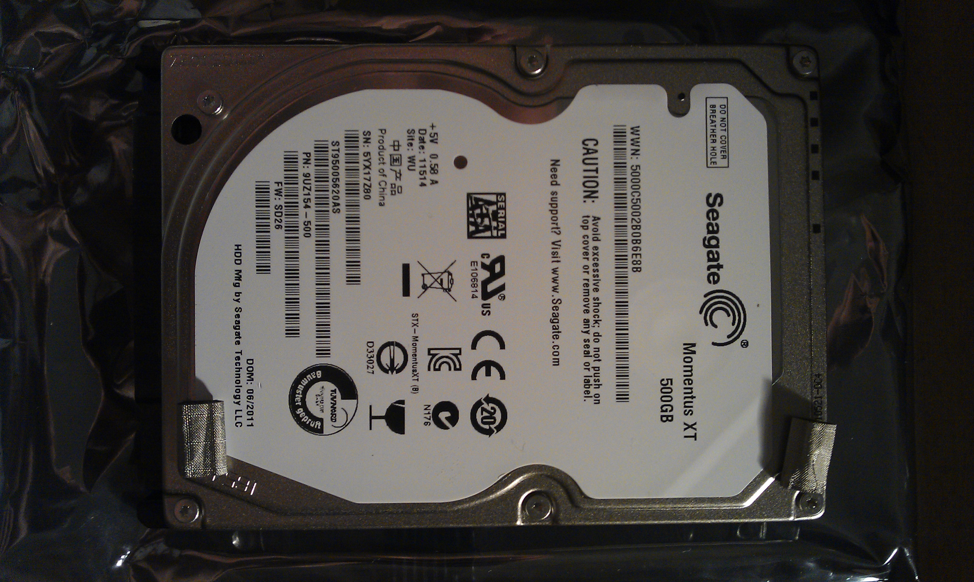Als ich nach einem langen schwül warmen Sommertag noch vor dem großen Regen zurück im Appartement bin, liegt da ein Karton von amazon, super! Im riesigen Karton ist eine winzig kleine Seagate Momentus XT 500GB – die neue Hybridfestplatte! Ein kurzer Größenvergleich zeigt, das Ding sollte in den Mac Mini hineinpassen. Kurz die Hände waschen und die verschwitzten Klamotten ausziehen und dann geht es begleitet von einem leckeren kalten Bier gleich ans Werk.