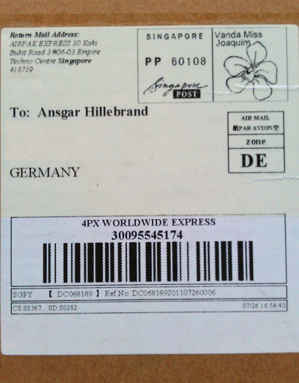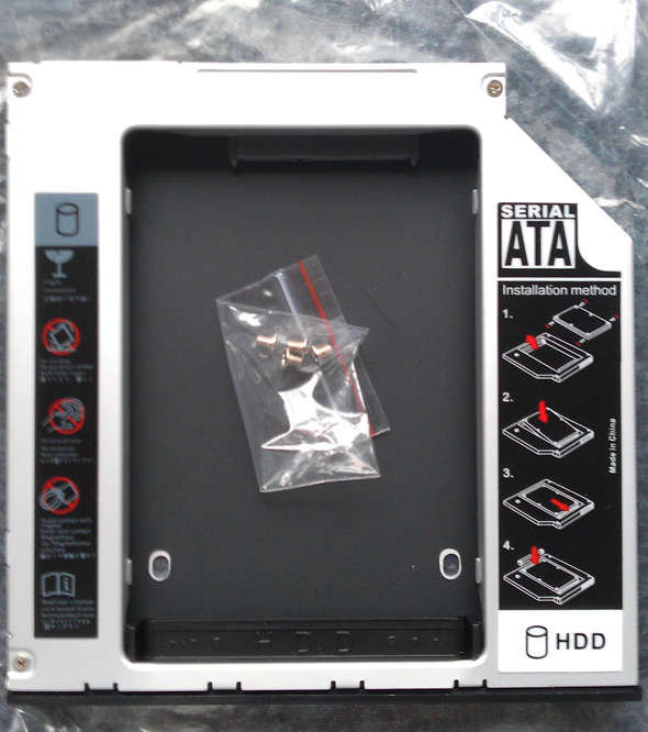 Vor ein paar Wochen habe ich ja schon beschrieben, wie ich mir mein betagtes DELL Inspiron 9400 mit mehr Speicher und einer neuen SSD-Platte modernisiert habe. Heute ging es mal wieder mit der blauen Turbine von Mainz nach Bonn und was finde ich im Briefkasten, ein Päckchen aus Singapur – genial! In diesem kleinen Karton ist ein Einbaurahmen für mein Inspiron. Diesen Rahmen kann man mit einer 2,5 Zoll SATA Festplatte bestücken und dann gegen das integrierte DVD-Laufwerk austauschen. Bestellt habe ich das Ding vor etwa 10 Tagen via eBay. Irgendwie war ich ja skeptisch, ob das mit der Sendung aus China wirklich klappt. Aber im letzten Jahr habe ich mir eine Mattscheibe für meine Hasselblad SWC auch ganz preiswert aus China kommen lassen. Das hatte damals gut geklappt und so war ich nun ziemlich „ermutigt“. Und, es hat ja auch funktioniert!