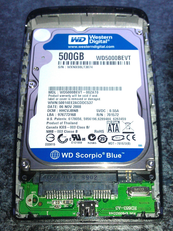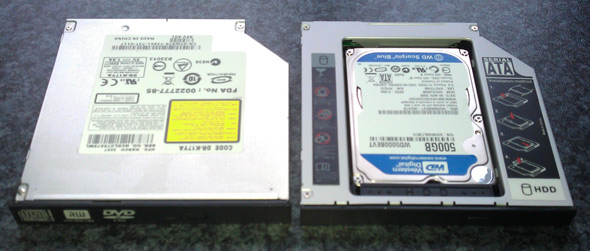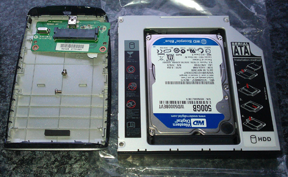 Im Schrank habe ich noch eine externe 500 GB Verbatim 2,5″ SATA Festplatte. Darauf ist eine Datensicherung der Fotos der USA-Reise 2009. Mit ein wenig Gewalt läßt sich das Kunststoffgehäuse öffnen. Zwei Minuten später ist die Platte in den Einbaurahmen gesteckt und mit zwei kleinen Schrauben fixiert. Schnell das Notebook umdrehen, die Schraube lösen, die das DVD-Laufwerk festhält, raus damit und rein mit dem neuen Teil aus Singapur. Umdrehen, Strom dran, einschalten, kurz warten, fertig. Wie genial ist das denn 🙂 Endlich klappt mal was auf Anhieb.