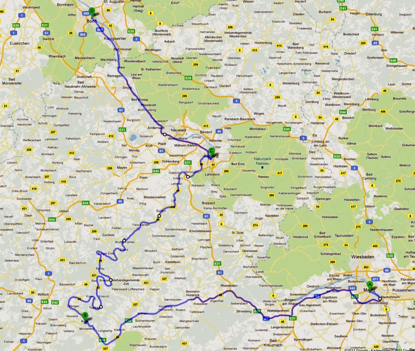 Hier nochmals die Tour in der Übersicht – das Video zeigt den Abschnitt von Bernkastel nach Koblenz und ein Stückchen der B9 in Richtung Bonn.