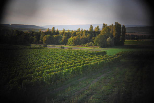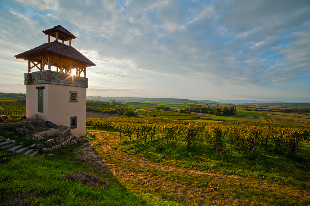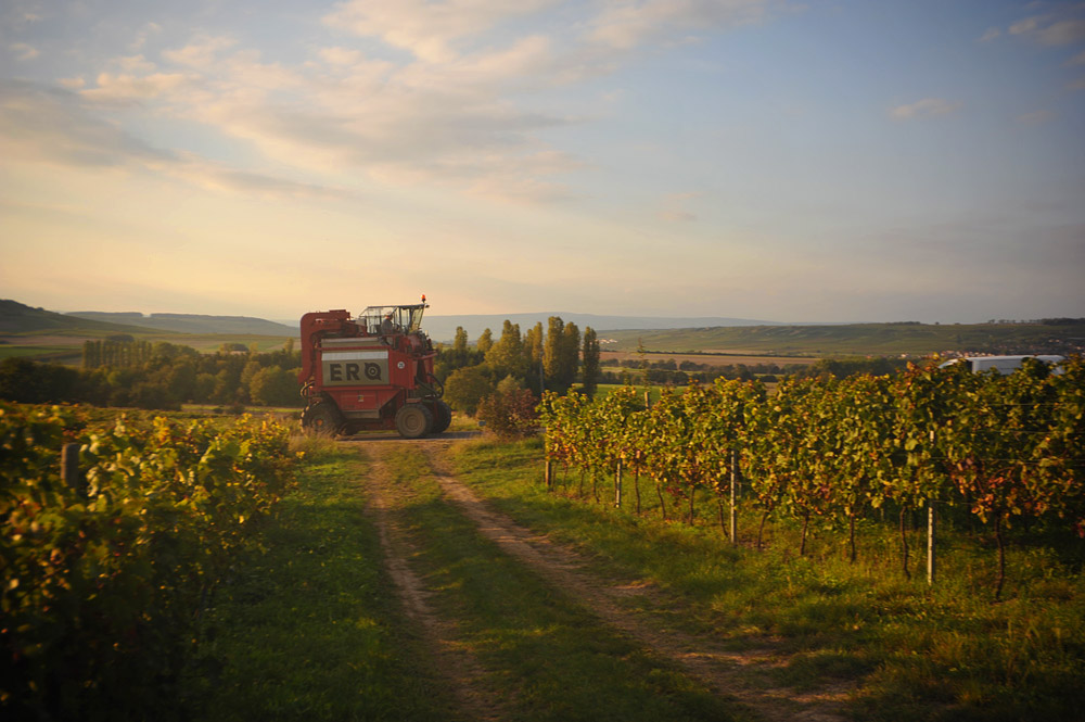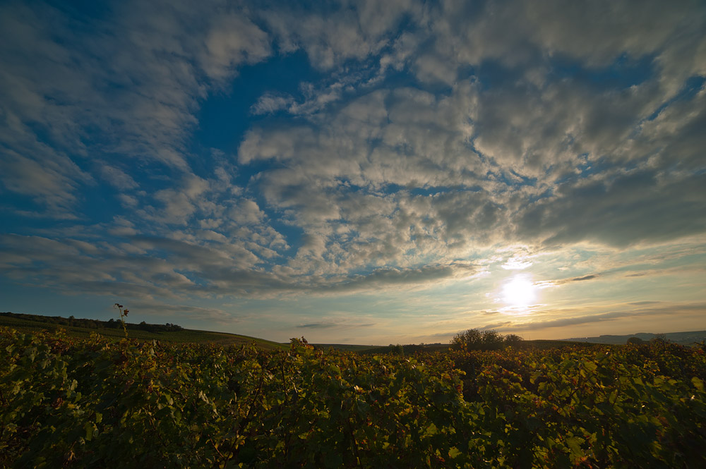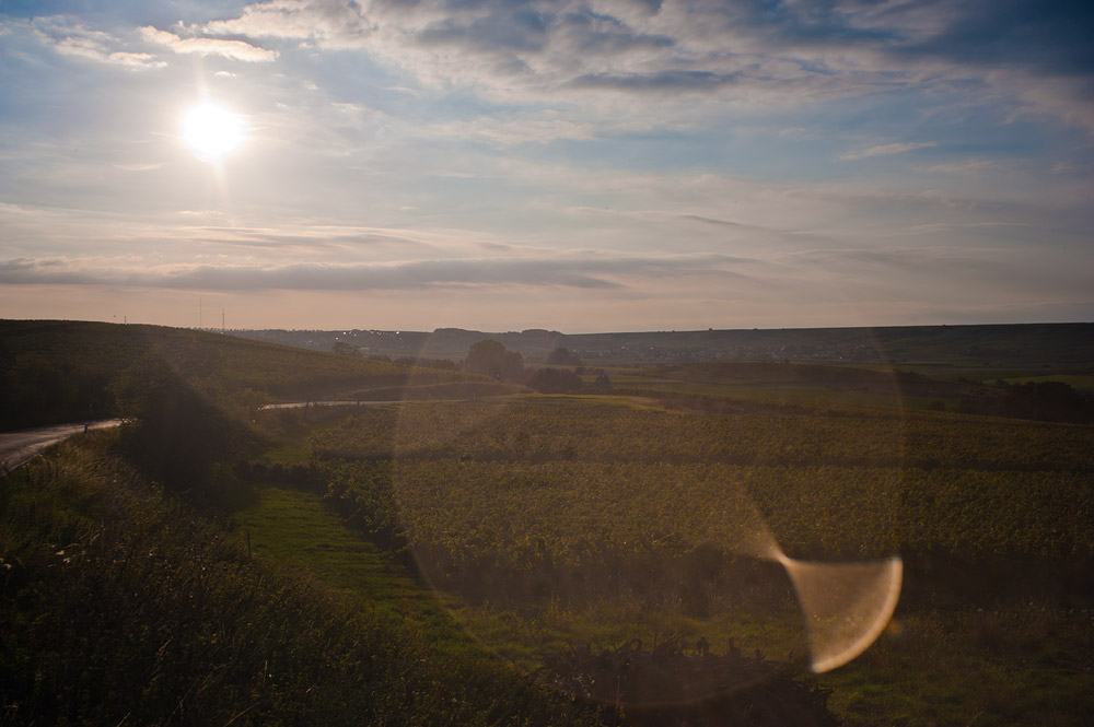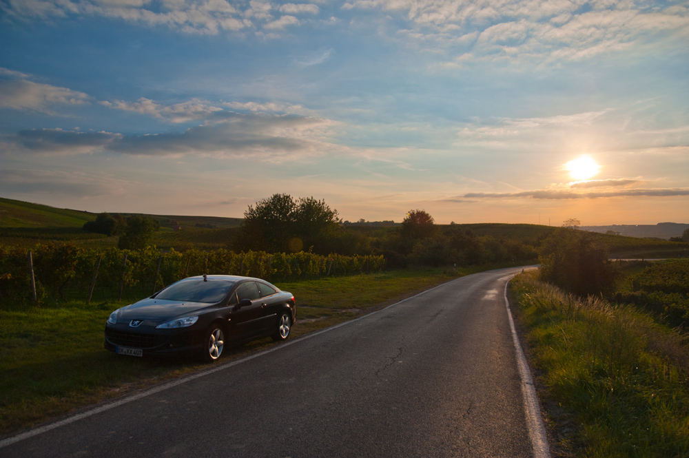 Nach der Waschanlage geht es dann auf die A60 und kurz darauf auf die A63 in Richtung Süden. Nach ein paar Kilometern verlasse ich die Autobahn und fahre einfach mal der Nase nach. Nach einer Weile finde ich die Straße wieder, die ich neulich zusammen mit meinem Freund Hermann mit dem Motorrad gefahren bin. Es geht durch wunderbare Weinberge. Überall sind Trecker unterwegs und es sieht für mich so aus, als würde gerade die Spätlese eingefahren.