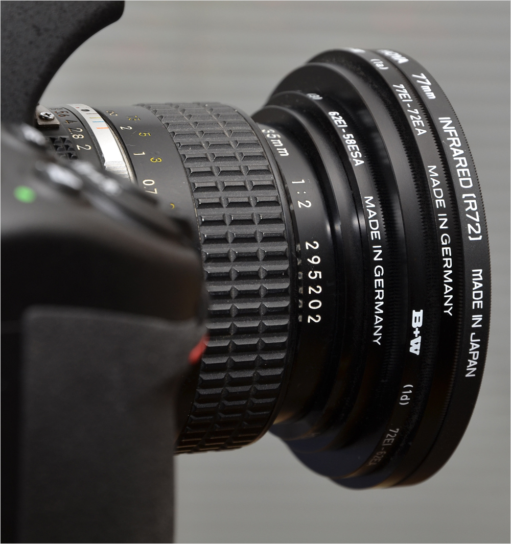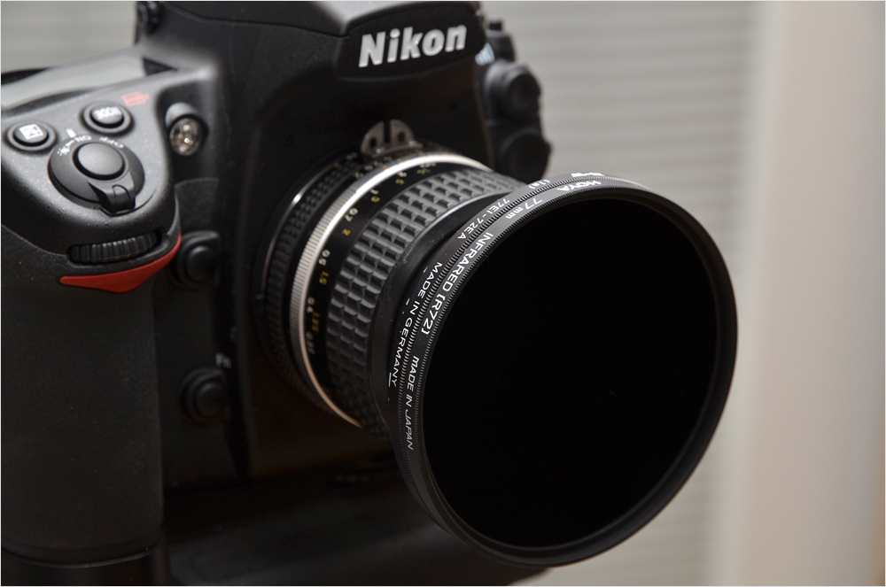 Daher habe ich hier zwei „indoor“ Fotos der D700 mit dem 2.0/35mm und dem Infrarot-Filter die ich eben für Euch mit der D7000 und einem Nikon SB-800 gemacht habe. Mit dem SB-800 habe ich einfach nach oben gegen die weiße Decke geblitzt. Man sieht hier sehr schön, dass dieser IR-Filter fast schwarz ist. Ist er vor dem Objektiv, sieht man nichts aber auch gar nichts durch den Sucher. Auch der Live-View funktioniert damit NICHT!