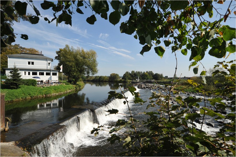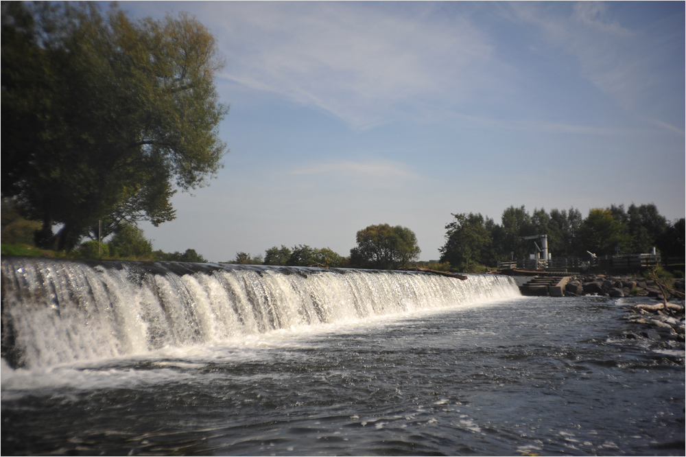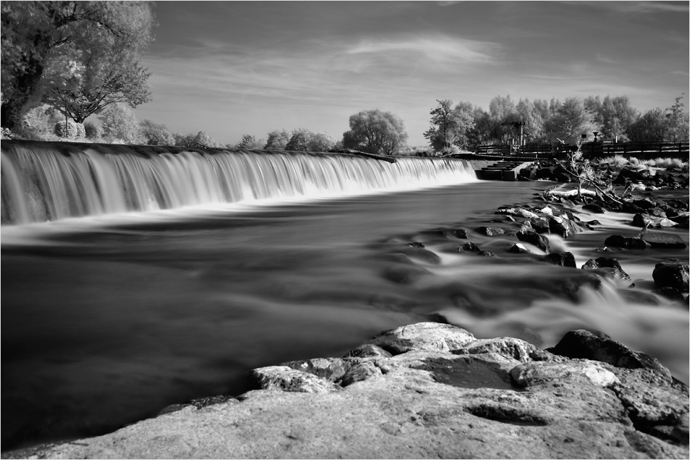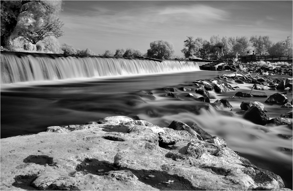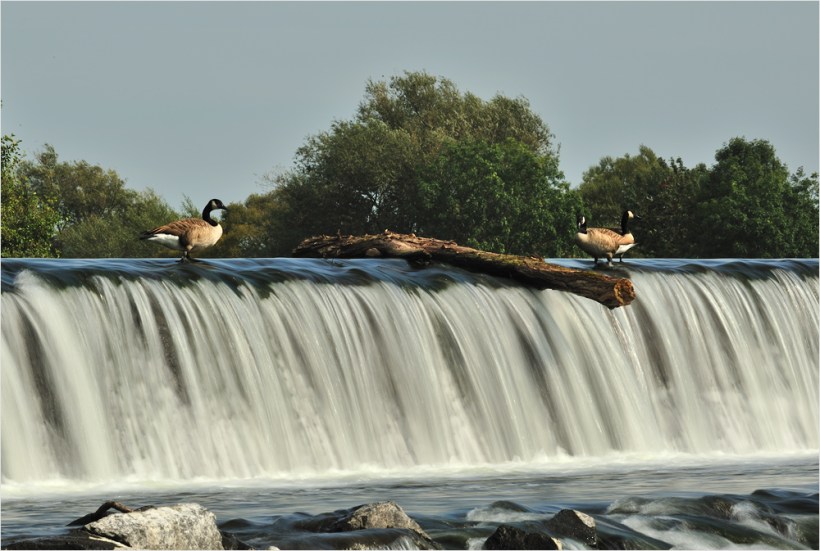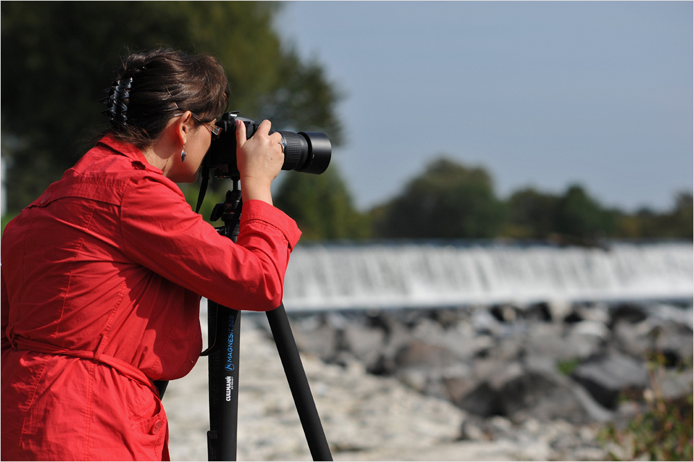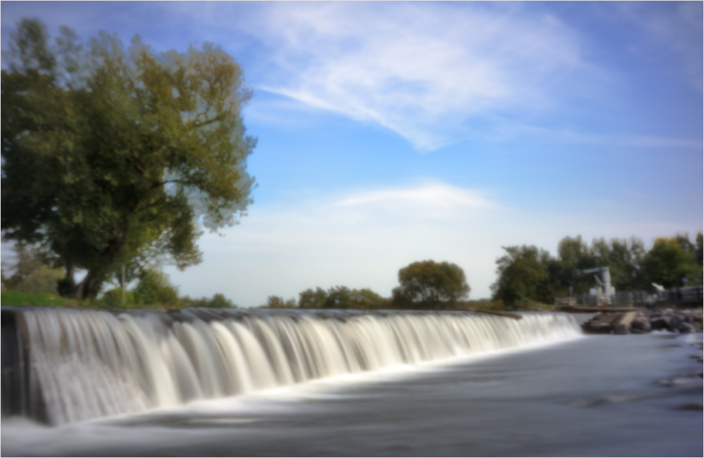 Dann kommt ein 8x Graufilter vor die Linse. Aber es ist trotz allem viel zu hell für „normale“ Fotos mit Bewegungsunschärfe innerhalb der vom Wehr herabstürzenden Wassermassen.