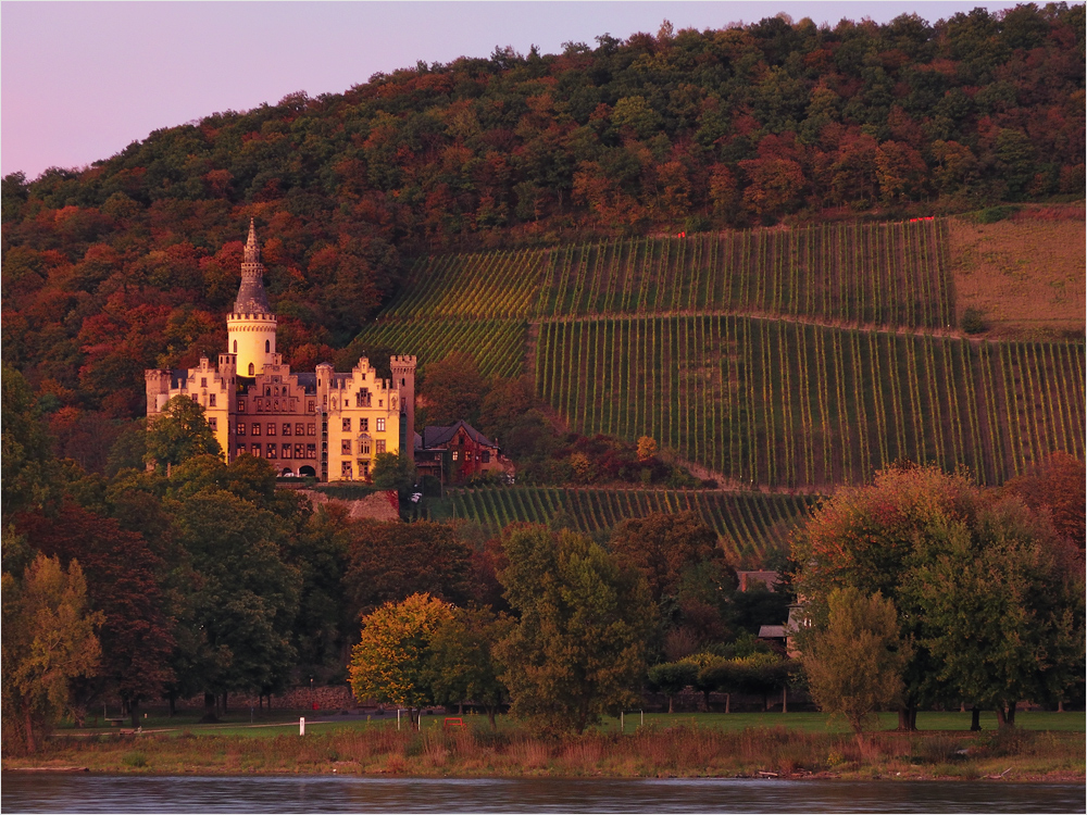 Hier ein wunderschönes Weingut auf der anderen Rheinseite im letzten Abendlicht bei voller Tele-Brennweite. Die Kamera habe ich dabei mit Selbstauslöser bedient.