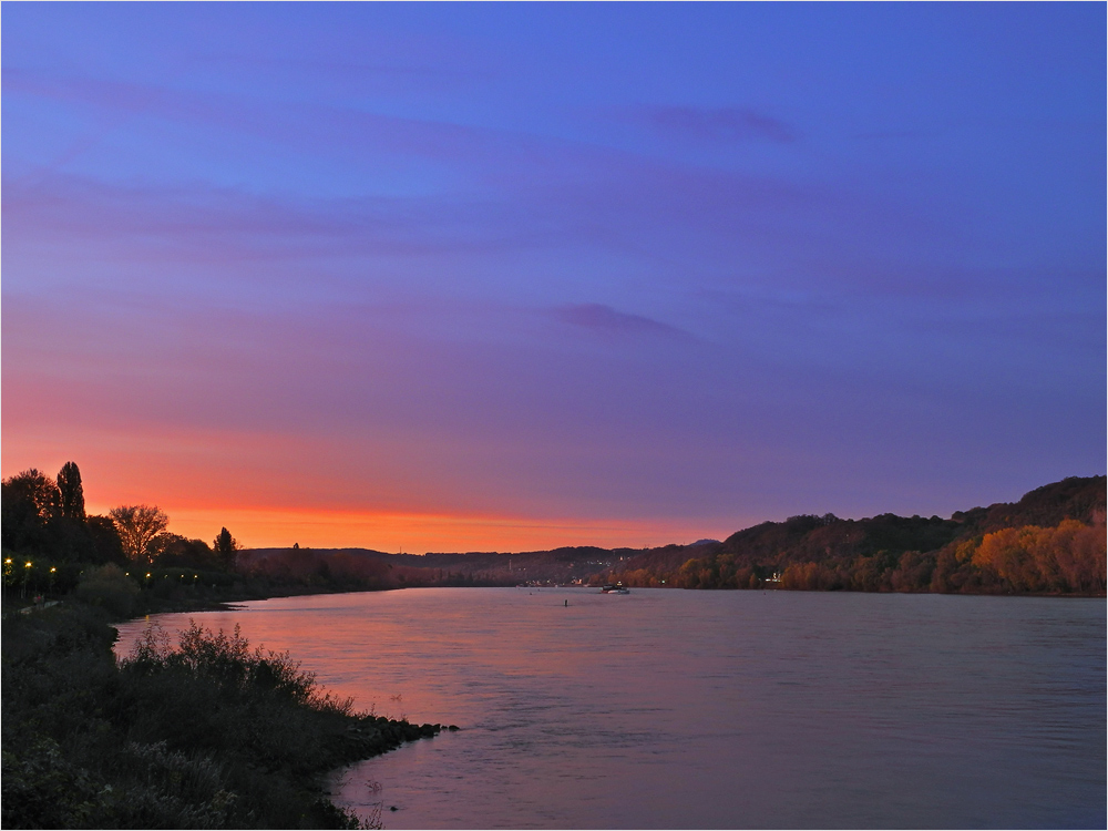 Egal, das Ding ist halbwegs gerade angebracht. Ich falte den Kameragurt ein wenig und so gelingen ein paar nette Fotos der „Rheinischen Abendstimmung“.