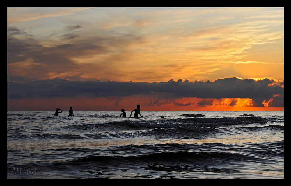 Starten wir mit einer kleinen Abendstimmung die während der Anreise bei einem kleinen Zwischenstopp in Schweden entstanden ist. Wirklich gut gefällt mir hier der Abendhimmel und wie sich die Kinder als Silhouetten im Wasser abheben.