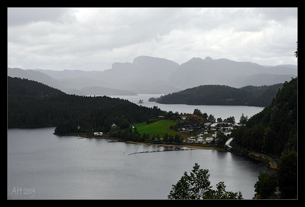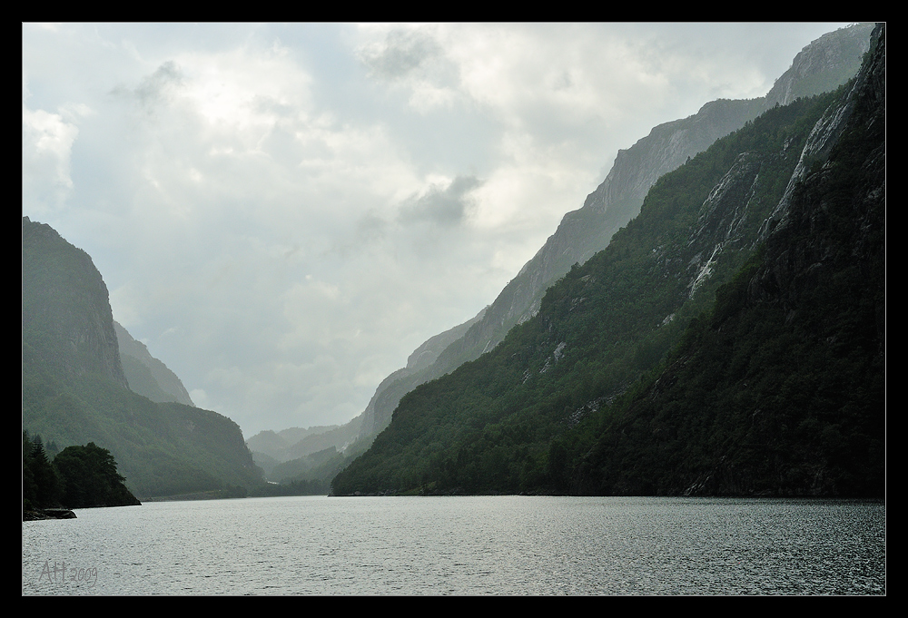 Hier ein Blick in einen Fjord den ich von einem Parkplatz direkt am Wasser aus fotografiert habe. Mein Sohn und ich waren etwas länger als zwei Wochen mit einem wirklich coolen Wohnmobil unterwegs. Leider war das Ding so riesig, dass man fast nie dort anhalten konnte wo es wirklich toll aussah. Ein echter Nachteil dieser „Wüstenschiffe“. Hier mag ich die für diese Reise typische leicht verregnete Stimmung und die Abstufung der Felswände an beiden Seiten des Fjordes. Ich denke, dieses Bild ist irgendwo am Hardanger-Fjord entstanden.