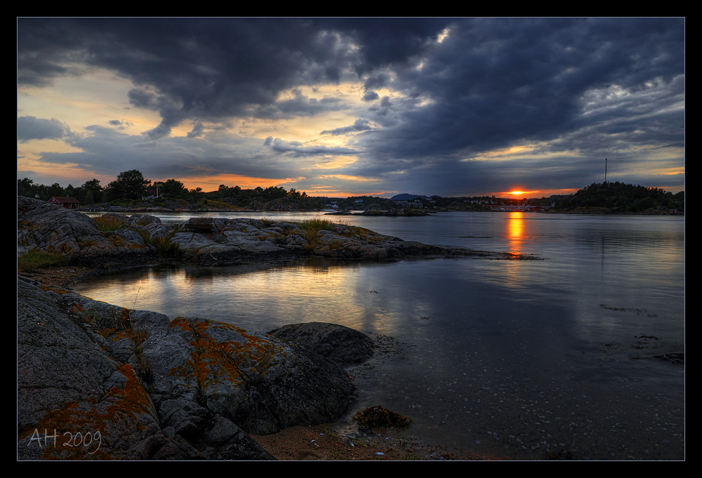 An dieses Bild kann ich mich auch noch gut erinnern. Es ist in der Nähe von Grimstad entstanden. Wir hatten unser Wohnmobil auf einem wirklich abgelegenen Camping-Platz am äußersten Zipfel einer Halbinsel geparkt und sind zum Sonnenuntergang ein wenig auf den Felsen am Meer herum geklettert. Mein Sohn hatte meine D60 samt 18-200er Superzoom dabei, ich die D300 mit 2.8/17-55 und 4/12-24. Ich habe ihm noch zugerufen, dass er vorsichtig sein soll, denn die Felsbrocken waren glitschig. Kurz drauf lag ich dann selbst auf der Nase und die Gegenlichtblende meines Nikon AF-S 2.8/17-55 war nur noch ein Stückchen Plastikschrott. Aber dieses Foto war es wert!!