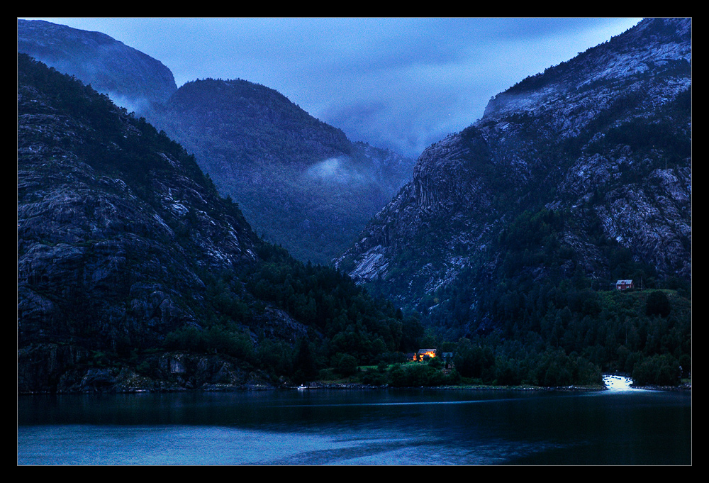 Hier habe ich ein Foto von der gegenüberliegenden Seite des Fjordes. Rechts neben dem einsamen Holzhaus ergießt sich ein kleiner Fluß in den Fjord.