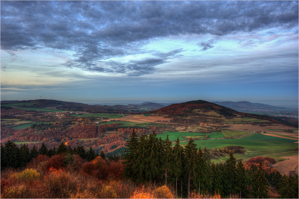 Die Sonne steht tief als es weitergeht. Wir fahren in Richtung Mayen. Auf dem Rückweg von Otzenhausen bin ich durch Mayen und dann nach Bell gefahren. Etwa auf halber Strecke hat man einen schönen Blick in ein bewaldetes Tal mit wirklich schönen herbstlich bunten Laubbäumen. Als wir dort ankommen geht die Sonne aber nicht dort unter wo ich es erhofft habe, sie ist dabei hinter einem kleinen ehemaligen Vulkan zu verschwinden. Als wir eine Schild finden „Frei bis Waldparkplatz“ biegen wir ab und folgen der Straße. Später am Parkplatz habe ich ein „Déjà Vue“. Vor vielleicht 8 oder 9 Jahren war ich hier schon einmal. Oben auf dem Hügel – sorry – Vulkan – ist ein kleiner schöner Aussichtsturm. Also schnappe ich mir meinen Rucksack. Drin sind die D7000, die D700, diverse Objektive, Batterien, Filter, Ladegeräte und draußen hängt das neue kleine leichte Carbon-Stativ dran.