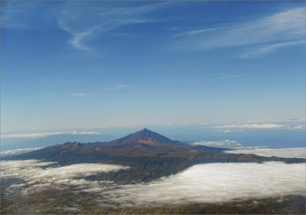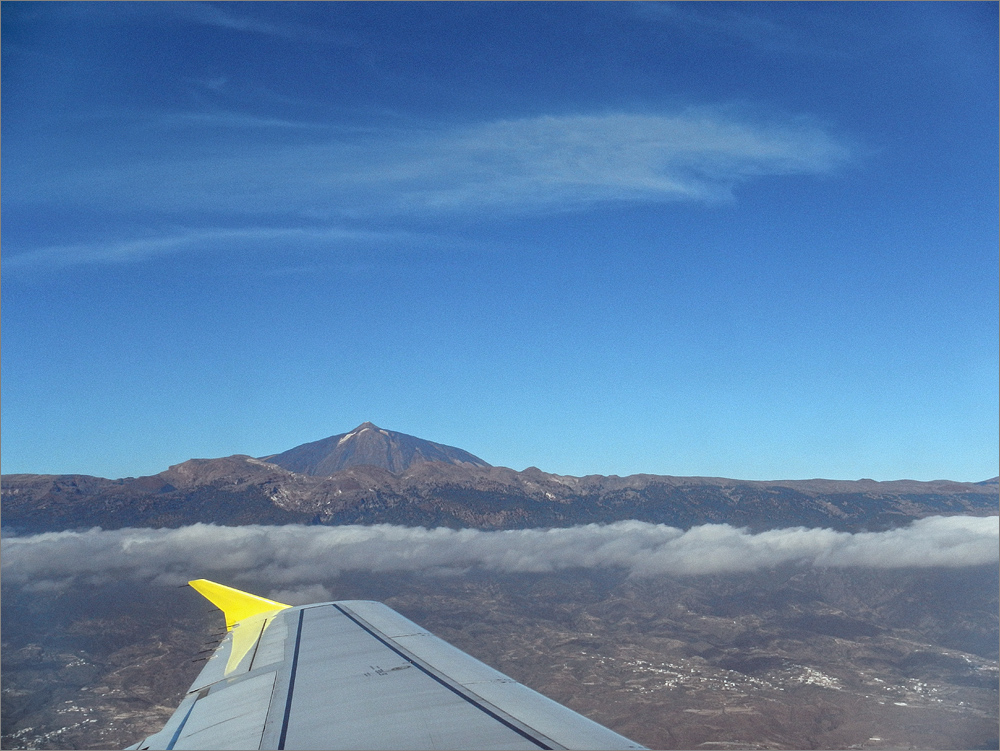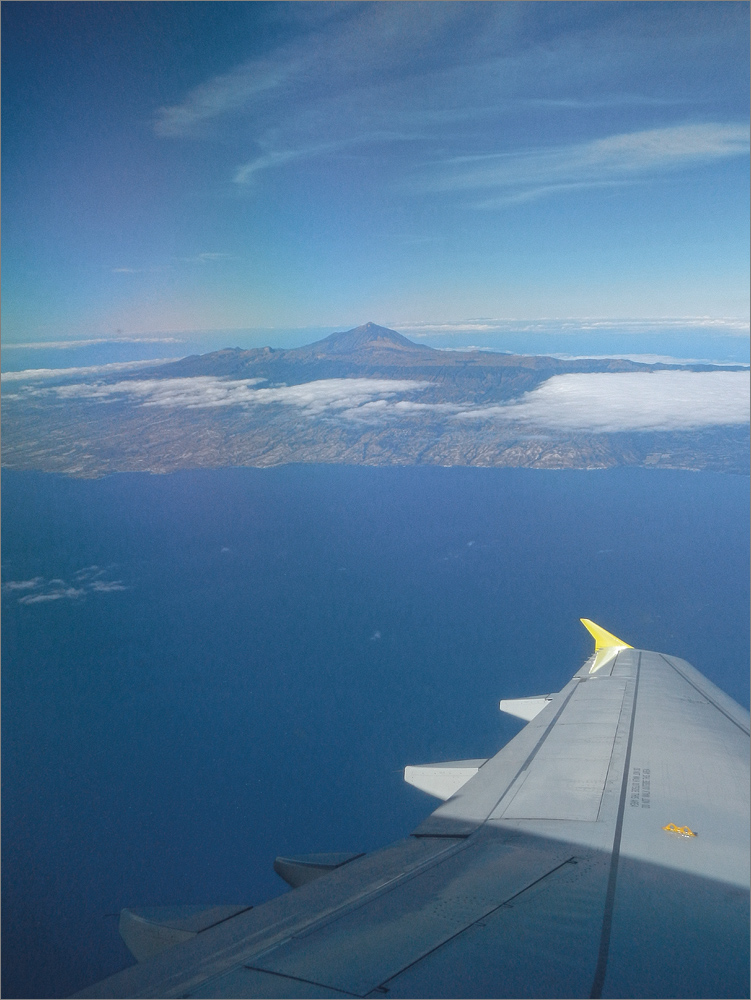 Zurück zum Flug, während des Starts und einige Minuten danach ist der Himmel klar und der Pico del Teide wunderbar zu sehen. Später fliegen wir über ein schier endloses Wolkenmeer. Als wir Spanien erreichen reißen die Wolken auf, die Sicht ist wunderbar und ich beginne mich auf daheim zu freuen. Während dessen denke ich mir, dass es dort unten geniale Strecken für eine wirklich lange Motorradtour geben müsste. Irgendwann würde ich das mal mit einer BMW R1200 GS ausprobieren.