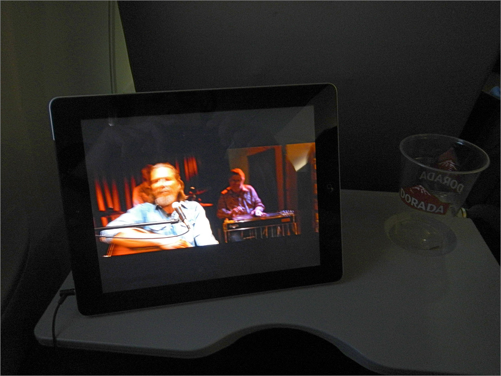 Nach dem Essen hole ich mein neues iPad heraus. Darauf sind noch zwei Filme die ich mir vor der Abreise in Deutschland von einigen DVDs auf das iPad kopiert habe. Dafür gibt es im Apple APP-Store ein kleines nettes Programm, die Qualität ist super und mit meinem BOSE Quiet-Comfort Kopfhörer ist sogar der Ton laut genug – super! Das iPad spielt beide Filme ab, insgesamt laufen sie über drei Stunden. Danach ist die Akku-Ladung noch bei 78%. Das ist wirklich cool, dieses Gerät würde also auch auf einem Interkontinental-Flug mehrere Filme abspielen. Ich denke eine Akku-Ladung würde locker für 8 bis 9 Stunden ausreichen, diese glänzende silberne Flunder ist eine wirklich gute Multimedia-Zentrale für lange Flüge.