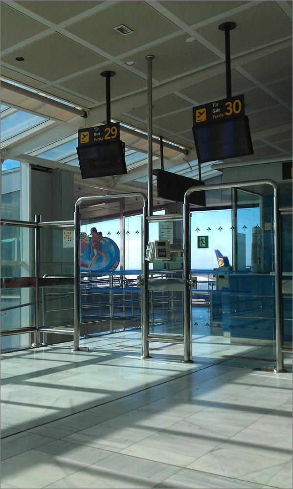 Der Check-In für unseren Flug mit German Wings ist am Schalter 25 und 26. Wir stellen uns am Schalter 26 an, es sind noch mehr als zwei Stunden bis zum Abflug, aber heute sind beide Schalter schon geöffnet. Vor uns stehen 5 Paare mit ihrem Gepäck. Wir bleiben dicht bei unseren Koffern. Der neueste „Trick“ der Diebe ist es, sich unter die Wartenden zu mischen und sich in einem unbemerkten Augenblick heimlich mit einer Notebooktasche oder anderen Wertgegenständen davonzuschleichen. Das wollen wir unbedingt vermeiden! Lange müssen wir nicht warten, nach etwa 20 Minuten sind wir an der Reihe. Zwischendurch mogelt sich scheinbar immer wieder ein Paar von der rechten Seite an den Schalter, aber es sieht nur so aus. Sie waren sehr früh hier und haben die Schlange angeführt. Aber ihr großer dunkelroter Koffer war viel zu schwer. Sie mussten auspacken, wegwerfen und ins Handgepäck umladen. Immer wenn ein Paar fertig ist, kommen sie dazwischen und wiegen ihr großes dunkelrotes Monstrum aus, immer wieder ist es noch zu schwer. Er schwitzt und ist total genervt, sie steht irgendwann ein wenig fassungslos daneben. Als wir an der Reihe sind unternimmt er einen neuen Versuch! Bingo, der Koffer hat endlich 20 Kilogramm. Sie dürfen passieren.