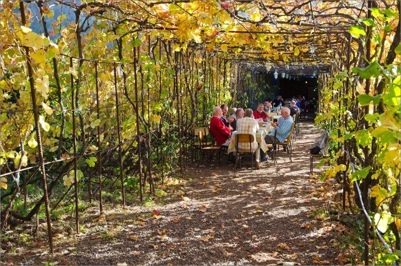 Ein paar Minuten später sitzen wir in einem echt urigen Restaurant mitten in einem Weinberg. Es ist fast wie ein Tunnel aus rostigen Eisenstäben der rundherum mit Weinreben bewachsen ist. Es gibt Garbanzas, hausgemachte Pommes Frites und Kaninchen vom Grill. Das entschädigt für die Strapazen. „Teppich Werner“ gibt die Bestellung in fließendem Spanisch auf. Ich verstehe nur einige wenige Bruchstücke. Er bestellt ein Steak (Solomio) und Kichererbeseneintop (Garbanzas). Irgendwas mit Salat und Pommes Frites (Papas fritas) ist auch noch dabei.