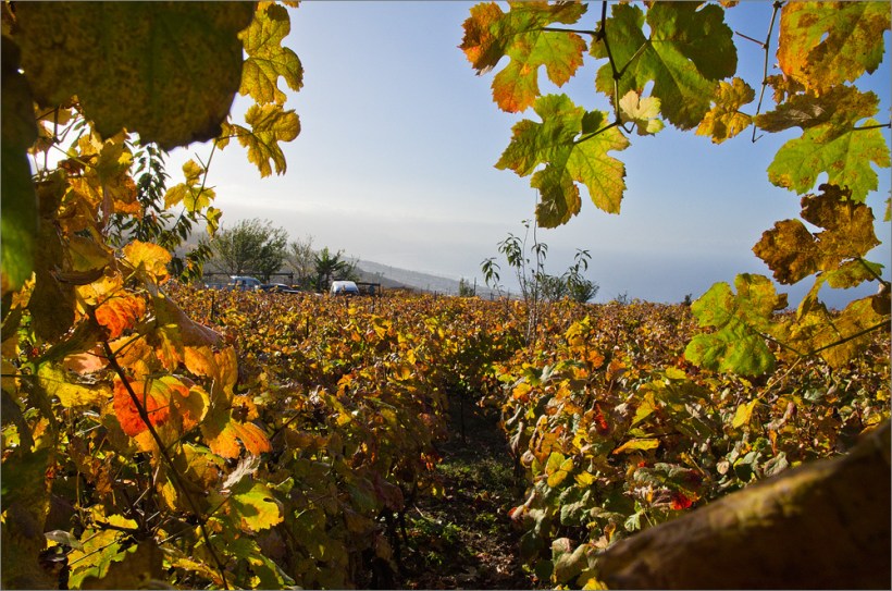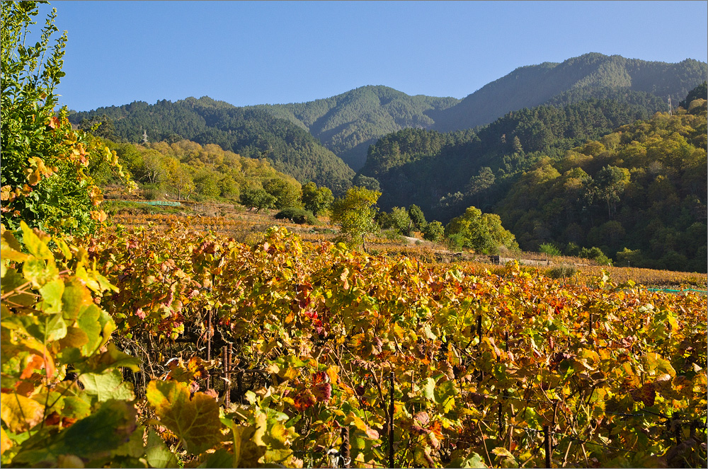 Nach einer Weile erreichen wir einen wirklich voll schönen einsamen Platz zwischen zwei Weinbergen. Aber von den fünf Autos sind nur noch zwei Autos übrig. Etwas später kommt ein drittes Auto dazu. Wir warten, aber wir bleiben zu dritt. Die Telefone haben hier oben keinen Empfang, Wolfgangs neues GPS zeigt etwa 500 Höhenmeter. Auto Nummer 3 macht also kehrt um die anderen Wanderer zu suchen. Nach einer Viertelstunde kommen sie jedoch allein zurück. Also alle wieder rein in die Autos und wieder runter ins Tal, nach einer kurzen Ehrenrunde geht es wieder bergauf, diesmal zu einem anderen Platz der auch wirklich schön ist. Wir parken die drei Autos neben einem kleinen Brunnen. Dort steht ein Canario mit seinem Auto und füllt viele viele Wasserkanister ab. Der ganze Kofferraum ist voller Trinkwasser.