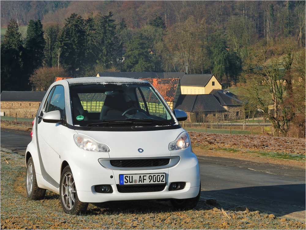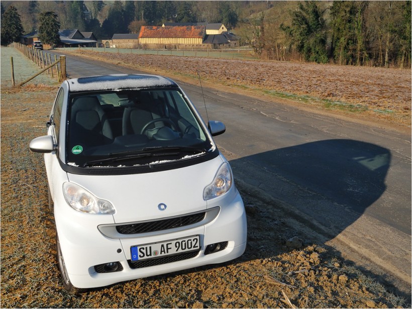 Kurz hinter Bonn Bad Godesberg biege ich auf eine kleine Landstraße ab und parke meinen Smart auf einem eingefrorenen Feld. Es ist Zeit für eine kleine Fotosession mit der Nikon P7100. Ich bin gespannt wie diese Kamera mit dem hellen Weiß des Fahrzeugs klar kommen wird! Auf dem Display erscheint die Lackierung viel zu hell abgebildet zu sein. Ich korrigiere den Belichtungsmesser auf -0.3EV und fotografiere im RAW-Modus. So kann ich später den Weißabgleich und viele andere Parameter ändern, ohne dass sich Verluste in den Bildern ergeben werden.