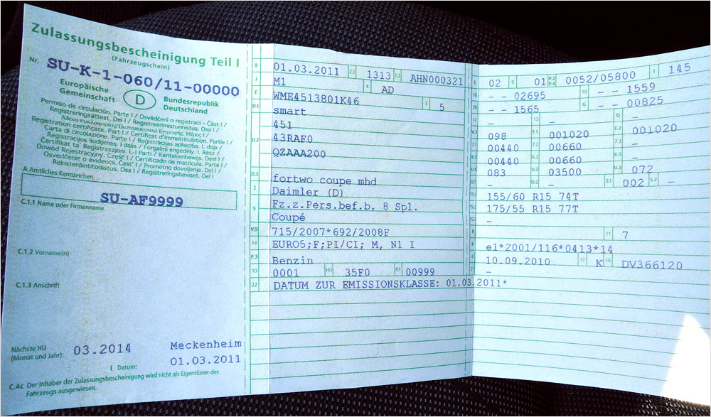 Auf dem Parkplatz einer Werkstatt wird noch schnell der Fahrzeugschein abgelichtet, vielleicht interessiert sich ja der eine oder andere Leser für die technischen Daten dieses kleinen feinen Autos!
