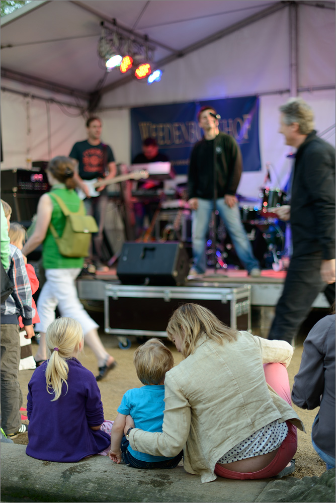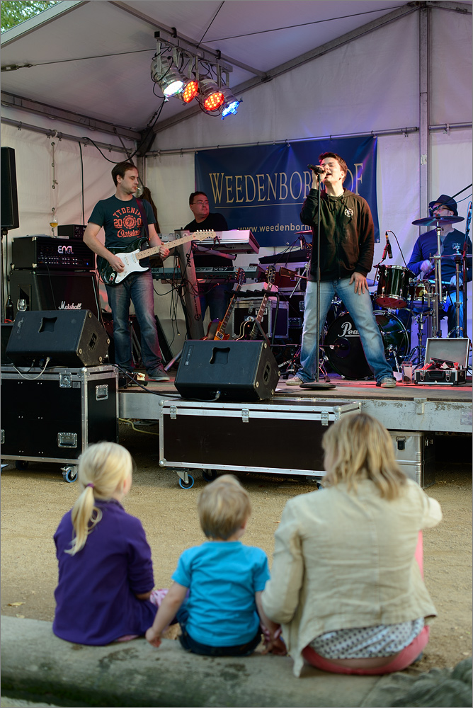 In der zweiten Version dieser Aufnahme habe ich im Modus „AF-S“ auf die drei Zuschauer fokussiert, den Auslöser festgehalten, den Ausschnitt verändert und dann die Kamera ausgelöst. Nun ist die Band unscharf abgebildet und die drei Zuschauer heben sich sehr schön ab. Das Bokeh ist größtenteils „ok“, aber besonders im Bereich der gelben Scheinwerfer ziemlich unansehnlich. Aber, bereits bei Blende 2.8 ist sogar bei diesen recht großen Distanzen eine gezielte Bildgestaltung durch die geeignete Wahl von Blende und Fokussierung möglich, sehr schön!