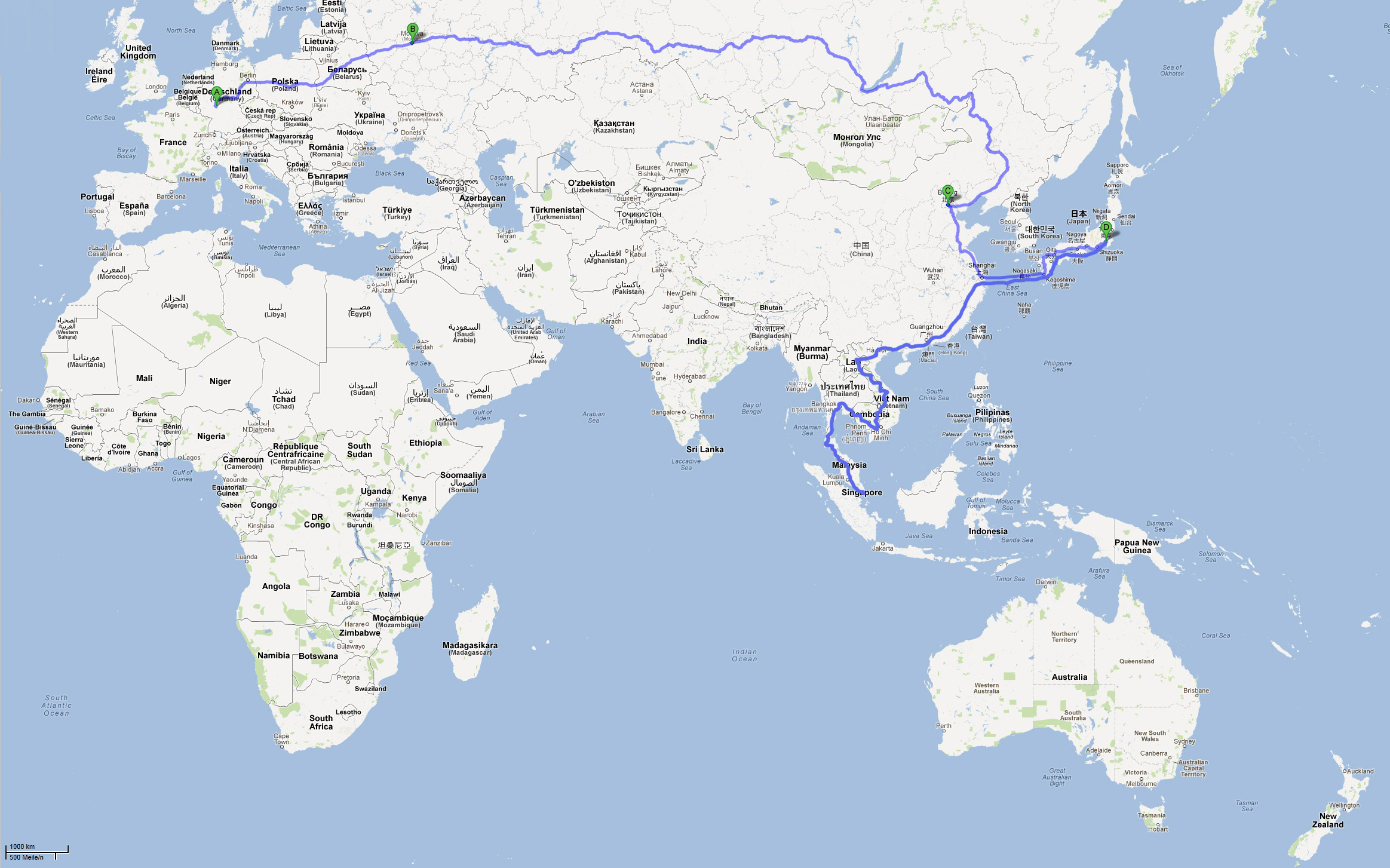 Seine Reiseroute habe ich versucht zu rekonstruieren. Vereinfacht man sie ziemlich stark, so sieht sie etwas so aus: (Anklicken für Originalgröße!)