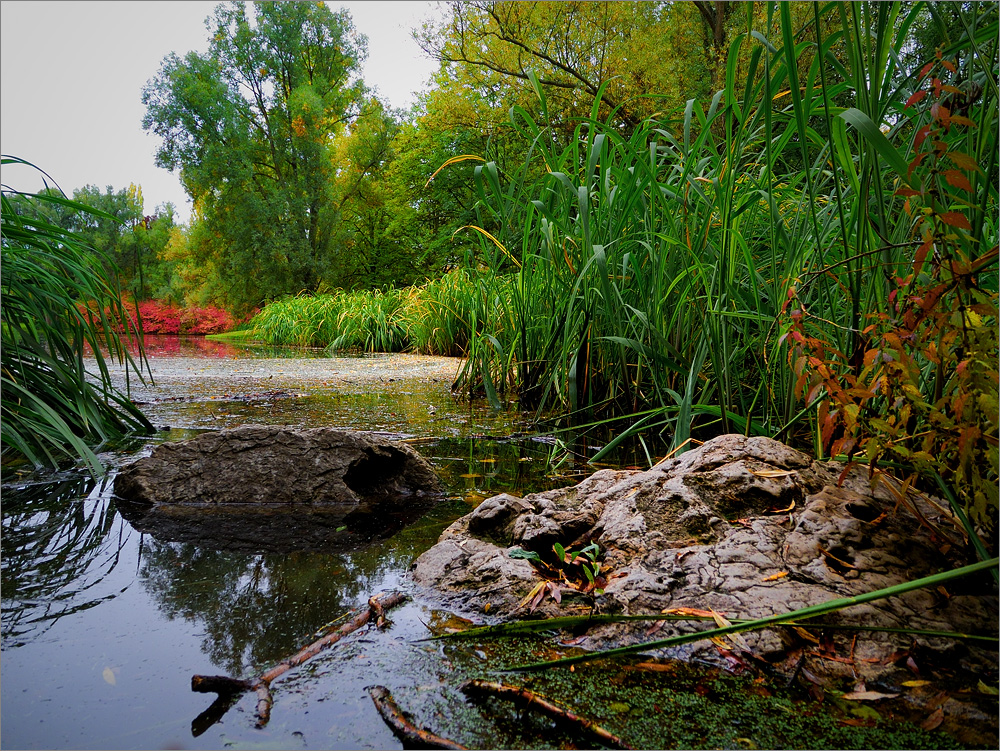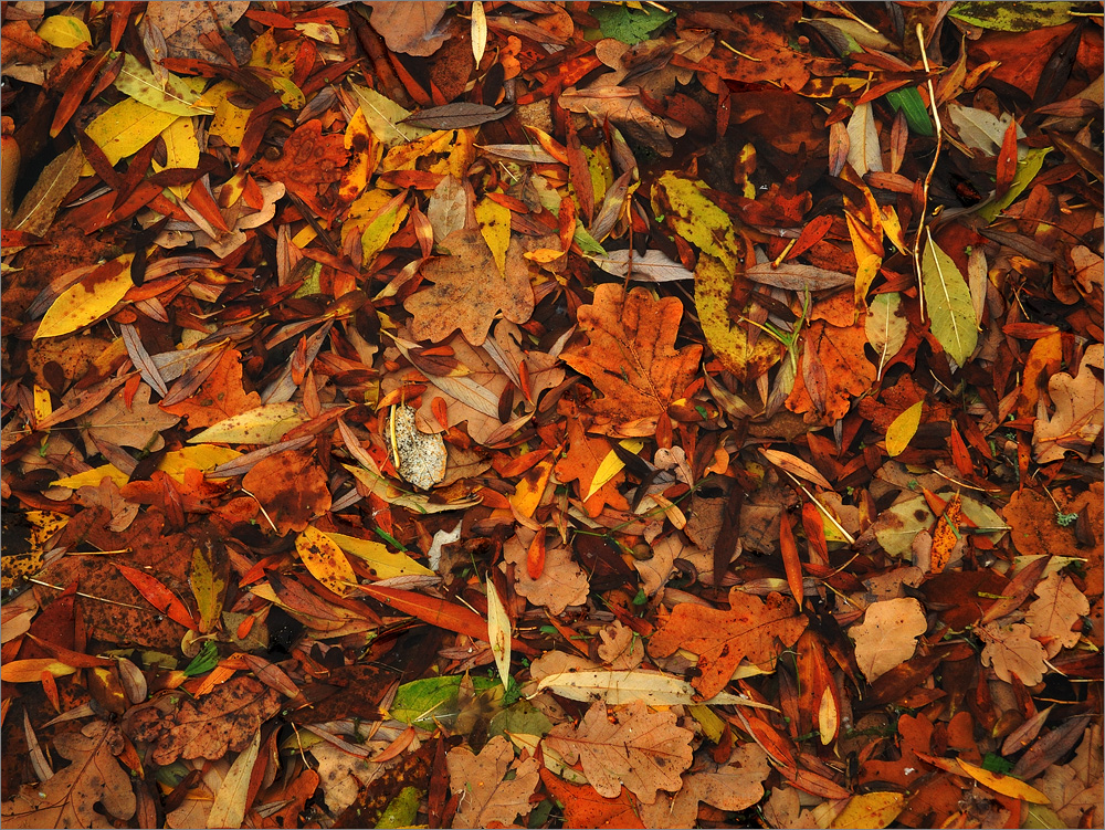 Ist man im Herbst an einem Teich unterwegs, so liegen im flachen Wasser am Ufer meist viele schöne bunte Blätter. Hier kommt wieder das schwenkbare Display der P7100 zum Einsatz. Man kippt das Display nach unten und hält die Kamera am ausgestreckten Arm lotrecht über das Wasser am Ufer. Fertig ist das wunderbare Farbenspiel.