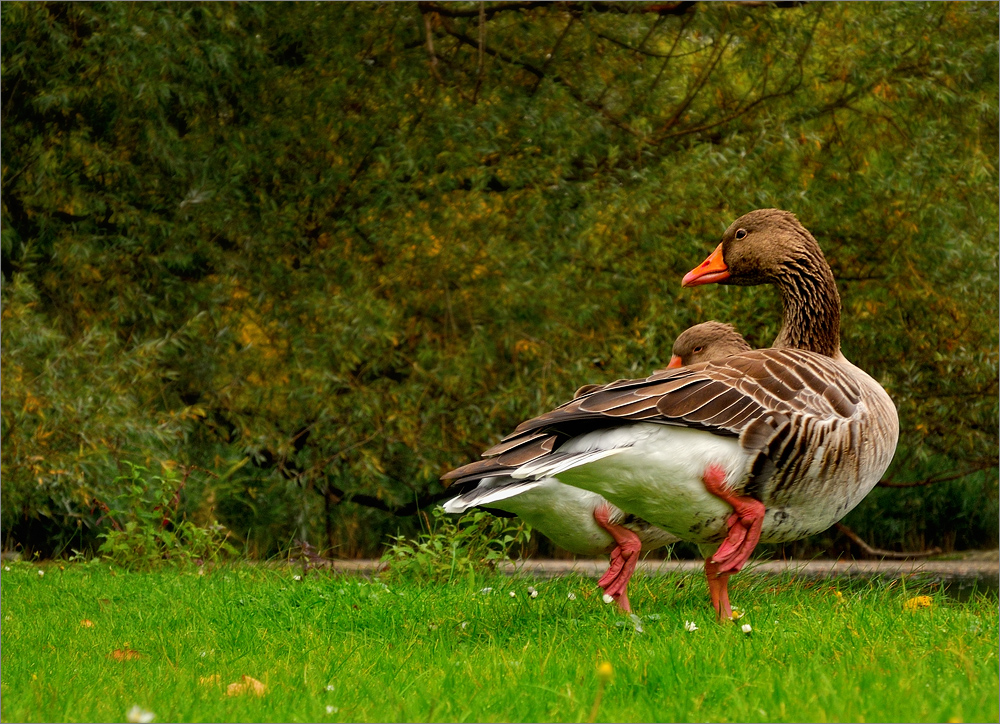 Hier nun ein Foto mit langer Telebrennweite und extrem tiefer Kameraposition. Durch die relativ lange Telebrennweite gelingt sogar mit dem winzigen Chip der Nikon P7100 eine leichte Unschärfe im Vordergrund und auch im Hintergrund. Das Bild ist im RAW-Modus aufgenommen, durch die Korrekturen während der „RAW-Entwicklung“ sind die Farben Satt und leuchtend. Das „Enten-Motiv“ ist weit nach rechts gerückt, in den „Goldenen Schnitt“. Dort wohin die Ente schaut ist viel Platz und die Augen des Betrachters folgen diesem Blick unfreiwillig. Man fragt sich was die Ente wohl beäugt haben wird. Und dann diese komischen Füße? Erst beim zweiten Hinsehen fällt auf, das sind zwei Enten in identische Körperhaltung. Durch die Perspektive ergibt sich ein reizvolles „Wechselspiel“.
