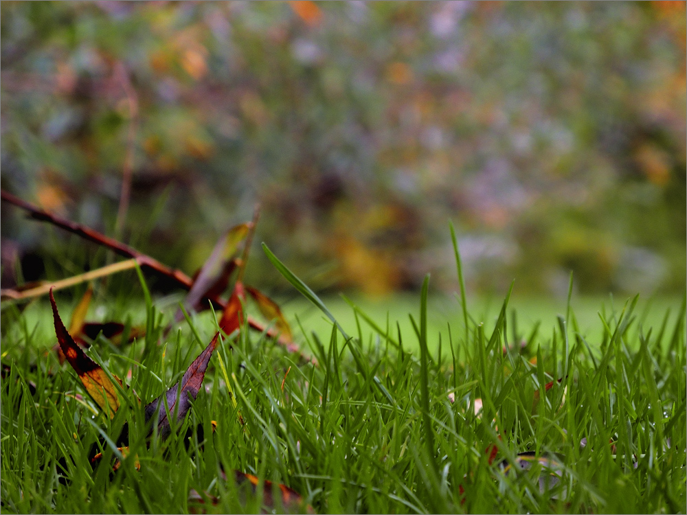 Diesmal habe ich im Makromodus auf die braunen Blätter im Vordergrund fokussiert, den Auslöser gedrückt gehalten (AF-Speicher), den Bildausschnitt neu gewählt und dann durchgedrückt bis die Kamera aus gelöst hat. Um Hintergrund ergibt sich eine malerische Unschärfe. Die vielen bunten Blätter tun ein übriges. Die Blätter im Vordergrund „erklären“ was man eigentlich sieht. Die Blätter sind verwelkt: „Aha, es ist Herbst!“ Die „Horizont“ liegt im unteren Drittel des Bildes, in Verbindung mit dem extremen Schärfeverlauf ergibt sich ein ungewöhnliche Foto das die Mehrzahl der Freizeitfotografen so nicht aufnehmen würde.