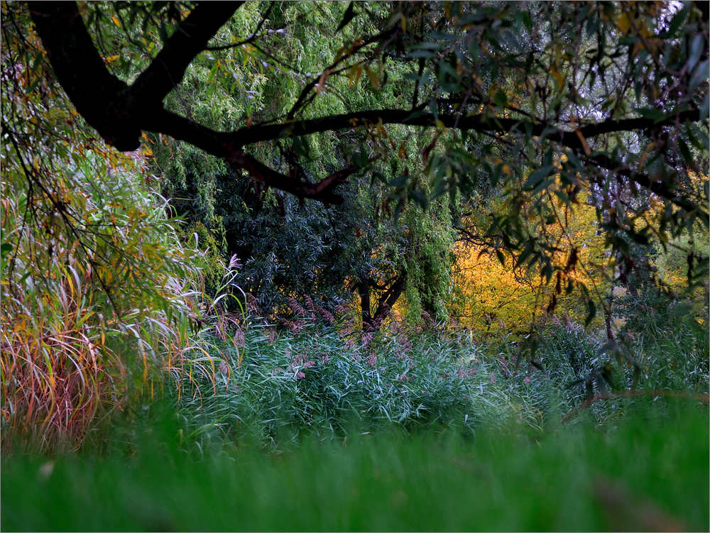 Diesmal habe ich auf den Hintergrund fokussiert und durch die tiefe Aufnahmeposition eine extrem Vordergrundunschärfe erzeugt. Der hell gelb leuchtende Strauch ist wieder in den goldenen Schnitt gerückt. Eigentlich ein stimmungsvolles Foto, doch der Ast stört irgendwie? Also versuchen wir es mal mit einem Ausschnitt aus diesem Foto (2000 Pixel breit, einfach anklicken oder in einem neuen Fenster öffnen).