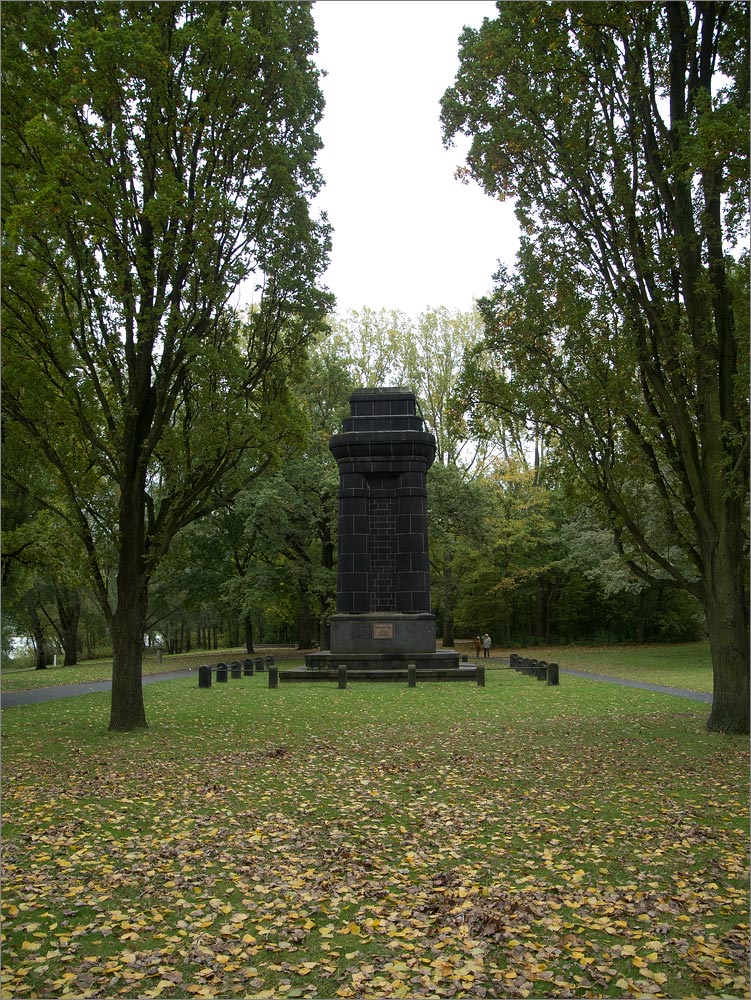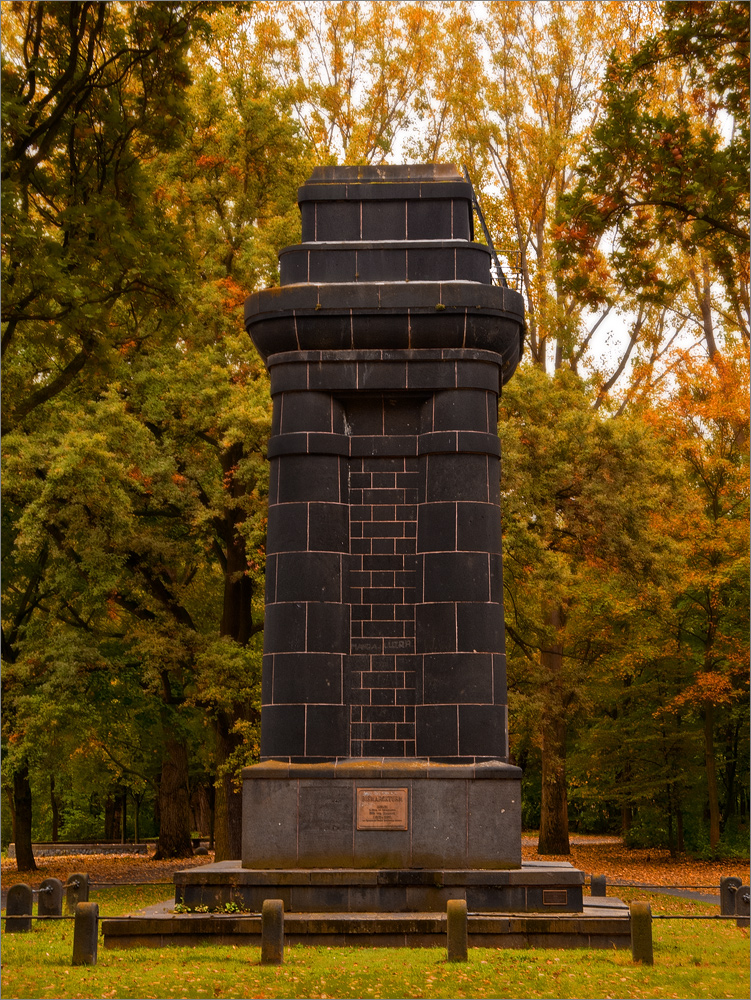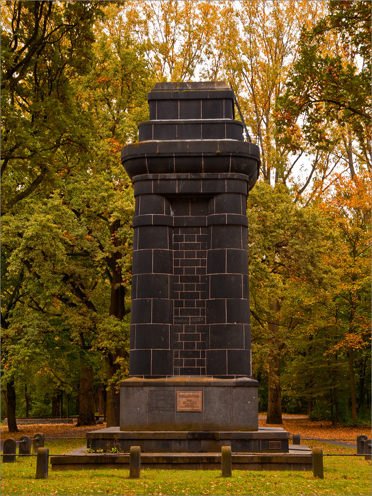 Das Ergebnis wirkt ein wenig wie beim derzeit so beliebten „Miniatureffekt“, aber dieser ist hier partiell auf die Baumkronen beschränkt. Das Laub am Boden ist perfekt scharf abgebildet, ach ja, eine künstliche Vordergrundunschärfe haben wir auch erzielt. Das Auge des Betrachters ist zunächst ein wenig verwirrt und wer sich nicht auskennt, dem wird nur auffallen wie deutlich sich jetzt das Denkmal vor seiner Umgebung absetzt. Kein schlechter Trick!