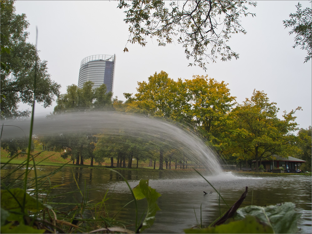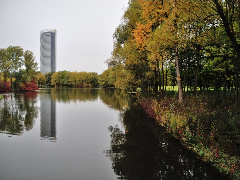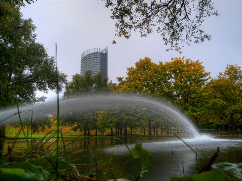 Und weiter geht es… Nun stehen wir auf einer kleinen Brücke und blicken hinüber zum Posttower. Die Spiegelungen im Wasser sind ganz nett, der Bildaufbau ist ok, aber die Farben sind blass und langweilig. Hier wird man auch mit Tonemapping und anderen Tricks nichts ausrichten können, oder doch?