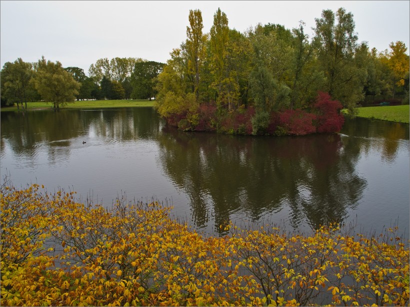 Kommen wir zum nächsten Tipp, dem Aufnahmestandort. Das erste Beispielfoto zu diesem Thema ist grundsätzlich ganz ok. Die Farben sind schön und es zeigt eine herbstliche ruhige Parklandschaft. Die kleine Insel ist im goldenen Schnitt platziert und im Vordergrund gibt es einige herbstliche gelbe Blätter.