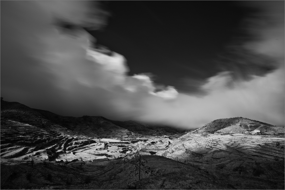 Sandra ist es zu kalt und sie bleibt mit ihrem Kindle im Auto zurück. Ich wandere mit der D800E, mehreren Objektiven und meinem großen BENRO Carbon-Stativ den Weg zum kleinen Gala hinauf. Immer wieder halte ich an und mache ein paar Fotos. Viele Bilder mit Infrarot-Filter. Das klappt besonders mit dem Nikon AF-S VR 4/16-35mm recht gut. Das Filtergewinde an diesem Objektiv ist fest mit dem Gehäuse verbunden und man berührt das eigentliche Objektiv-System nicht wenn man den Infrarot-Filter aufschraubt. Man kann also in Ruhe ohne den Filter sein Motiv wählen, korrekt scharf stellen und dann den Filter aufschrauben. Den Autofokus schaltet man zwischendurch auch noch ab und dann gelingen bei ISO-100, Blende 11 und 30 Sekunden (!!!) Belichtungszeit sehr ungewöhnliche Schwarzweiß-Fotos.